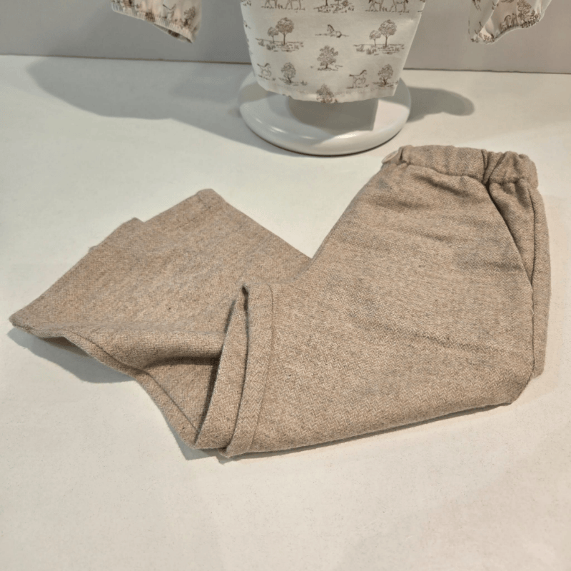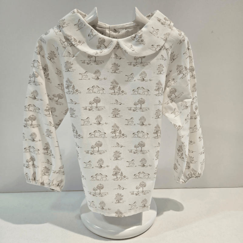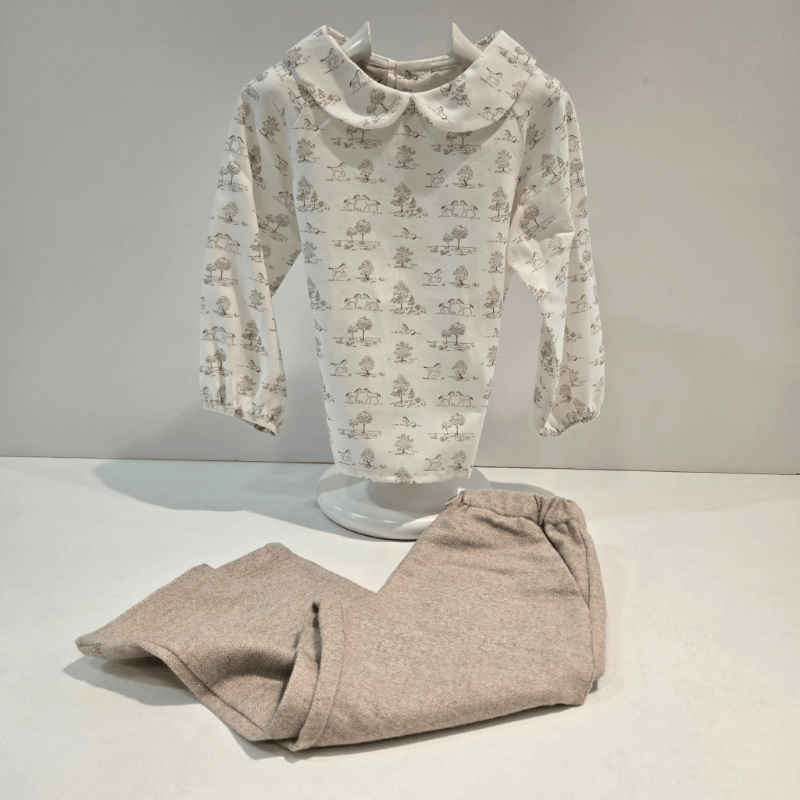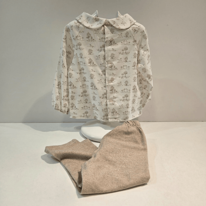 Conjunto para bebé de la firma Paz Rodríguez, perteneciente a la colección otoño-invierno, compuesto por una blusa estampada y un pantalón tejido en espiga color angora. La blusa, confeccionada en suave algodón blanco, presenta un delicado estampado de animalitos y árboles en tonos tierra, evocando la calma del bosque. Su cuello Peter Pan y los puños elásticos aportan un aire clásico y cómodo, ideal para los días frescos. El pantalón, en tejido espiga de textura cálida y color angora, está diseñado para ofrecer confort sin perder estilo. Su corte recto y cintura elástica permiten libertad de movimiento, mientras que el acabado en punto aporta un toque artesanal y elegante. Un conjunto versátil y encantador, perfecto para paseos otoñales, celebraciones familiares o simplemente para vestir con mimo a los más pequeños.