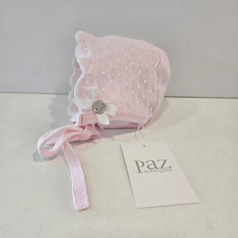 Capota punto rosa con puntilla ondas y bodoques verano. Capota de punto en rosa con ondas y bodoques de Paz Rodríguez verano.  Capota de punto puntilla, con ribete festoneado y lacito decorativo. Corte clásico con tiras para anudar bajo la barbilla. Tejido cálido y textura envolvente para los días fríos