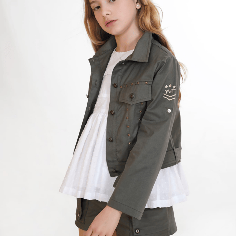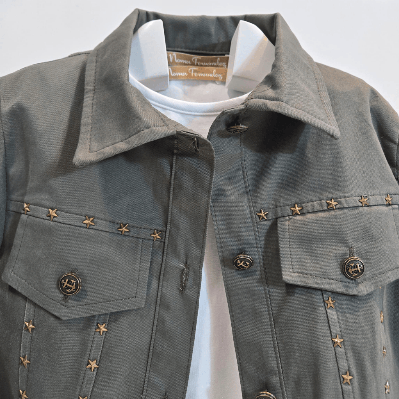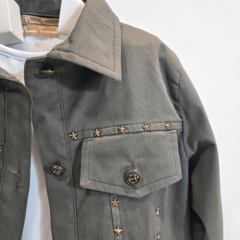 Cazadora 07 con estrellas y anclas relieve verde militar verano. Cazadora verde militar de Noma Fernández con estrellas decorativas y botones con anclas en relieve. Ligera, cómoda y perfecta para los días frescos de primavera–verano.