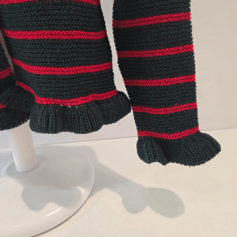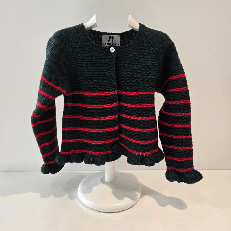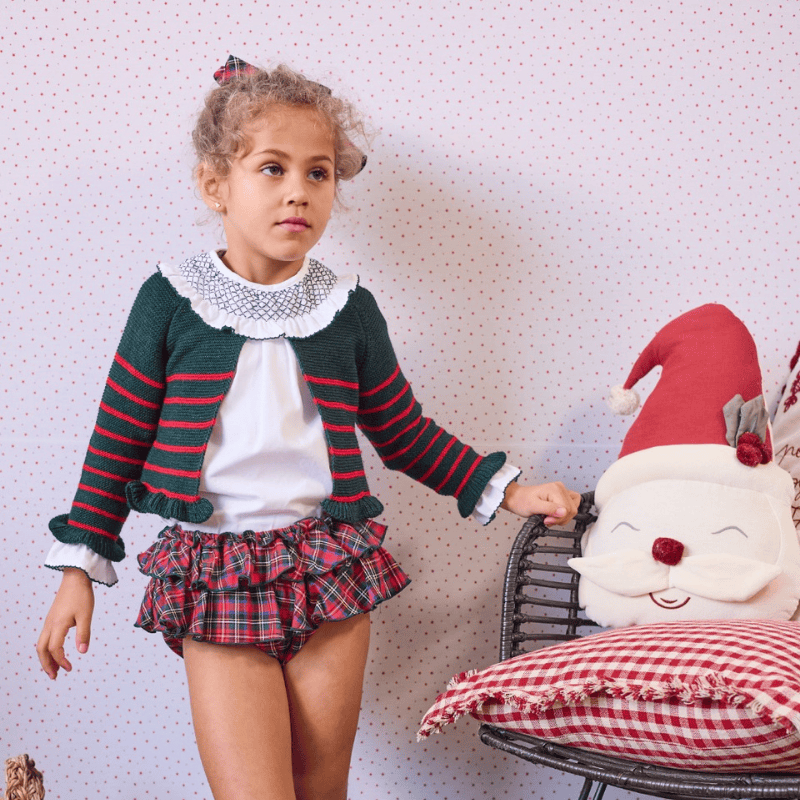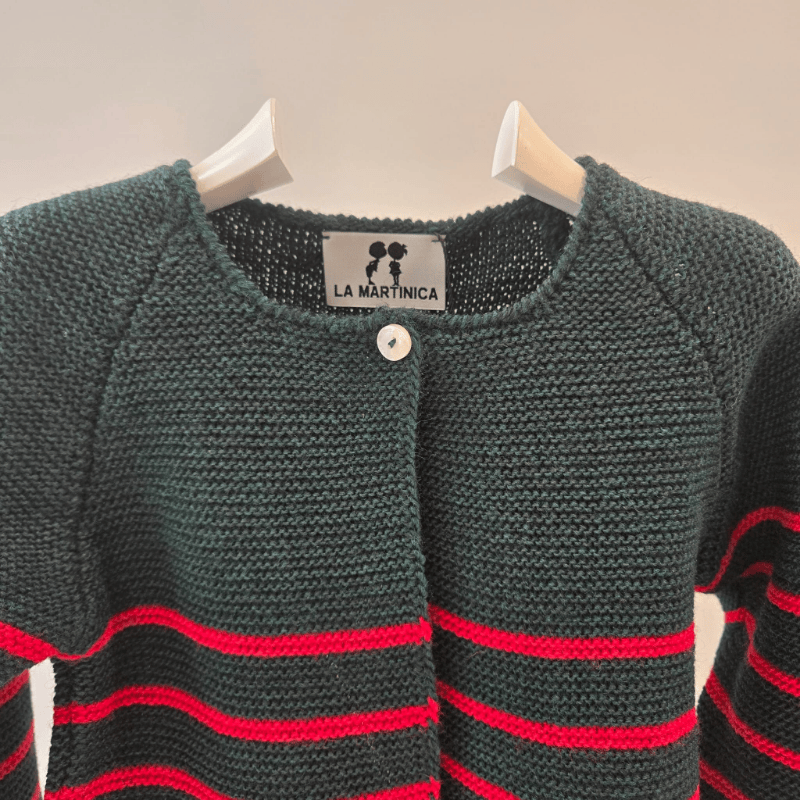 Chaqueta 3/4 de punto en color verde bosque, perteneciente a la colección Hilton de La Martinica para invierno 26. Su corte recto realza la silueta infantil con elegancia, mientras los volantes en el cuello y puños aportan un toque festivo y delicado. El tejido presenta un patrón de punto fino, cálido y suave al tacto, ideal para combinar con vestidos de cuadros o looks navideños. Los botones decorativos en el frontal completan un diseño pensado para ocasiones especiales. Disponible en Boutique Luna, donde cada prenda se selecciona con cariño para vestir la infancia con estilo y personalidad.