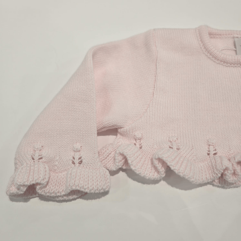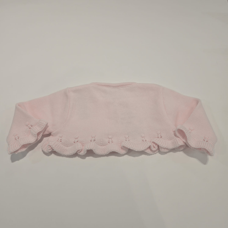 Chaqueta bebé modelo bico de Paz Rodríguez verano. La chaqueta modelo Bico de Paz Rodríguez presenta un corte clásico y delicado, con cuello redondo y cierre frontal de dos botones. El tejido de punto fino luce un patrón ornamental en el bajo, con ondas y pequeños motivos florales que aportan textura y encanto. Ideal para primavera-verano por su ligereza y suavidad.