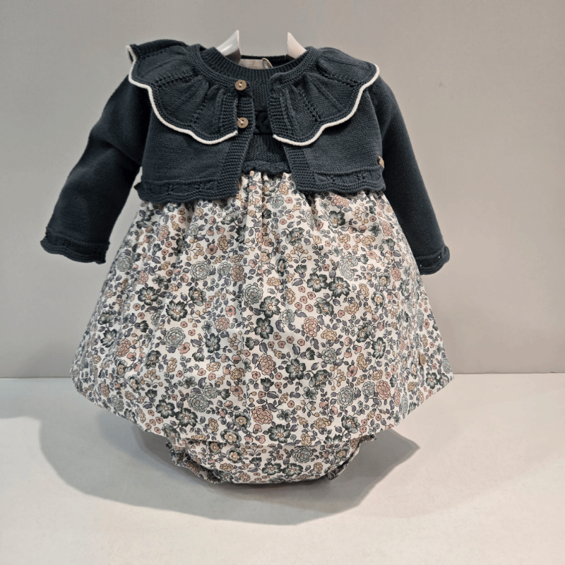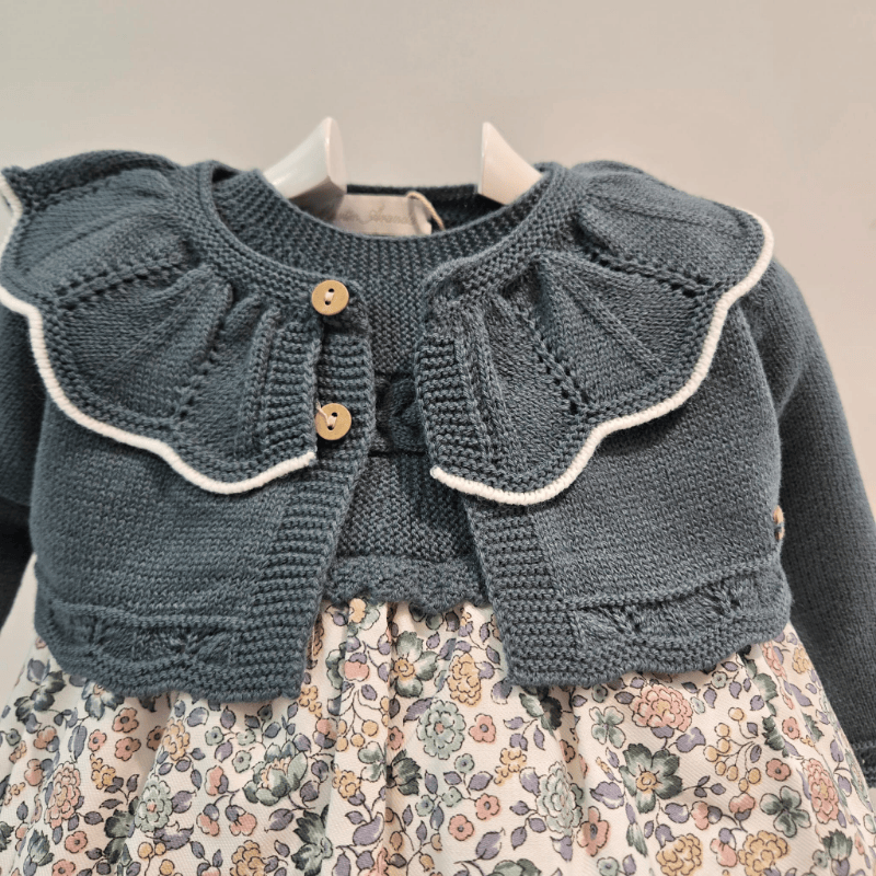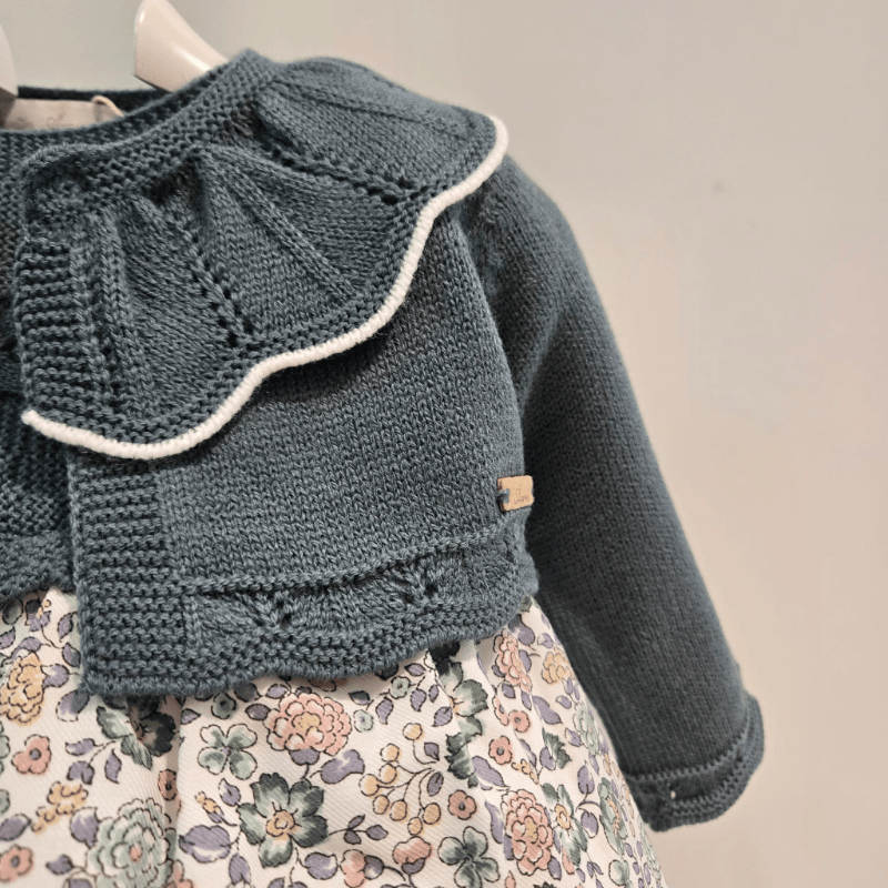 Chaqueta corta de bebé de la firma Martín Aranda, perfecta para completar los looks de otoño e invierno con elegancia y calidez. Confeccionada en punto trenzado de alta calidad en tono verde petróleo, presenta un patrón texturizado que aporta profundidad y distinción. El corte es clásico y ligeramente ajustado, diseñado para cubrir el torso sin limitar el movimiento del bebé. Destacan sus delicadas solapas en el cuello, rematadas con ribetes en contraste blanco roto, que añaden un toque vintage encantador. Se abrocha en la parte superior con dos botones color de madera, dejando el resto abierto para lucir el conjunto interior. El tejido es suave, cálido y transpirable, ideal para mantener la temperatura corporal en los días frescos. Una prenda versátil y atemporal, pensada para combinar con vestidos estampados o conjuntos lisos, disponible en Boutique Luna, donde cada detalle está pensado con cariño.