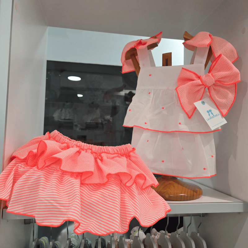 Conjunto blusa braga colección Happy vichy verano 2026. Conjunto “Happy” de La Martinica en cuadro vichy rosa, con blusa de volantes y lazadas. Braguita a juego con volantes y ajuste cómodo para el verano. Dulce, fresco y lleno de encanto estival.