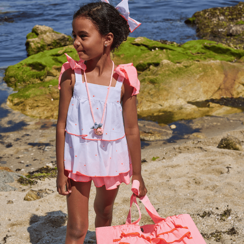 Conjunto blusa braga colección Happy vichy verano 2026. El conjunto “Happy” de La Martinica ilumina la temporada con su encanto fresco y veraniego. La blusa, confeccionada en tejido ligero y suave, presenta un diseño sin mangas adornado con volantes y lazadas en cuadro vichy rosa, aportando un movimiento delicado y un aire muy coqueto. La braguita a juego, también en vichy, incorpora volantes y un ajuste cómodo que abraza suavemente la cintura, permitiendo libertad de movimiento sin perder elegancia. Un conjunto pensado para los días de sol, donde cada detalle —desde los ribetes hasta los lazos— celebra la alegría y la dulzura de la colección Happy.