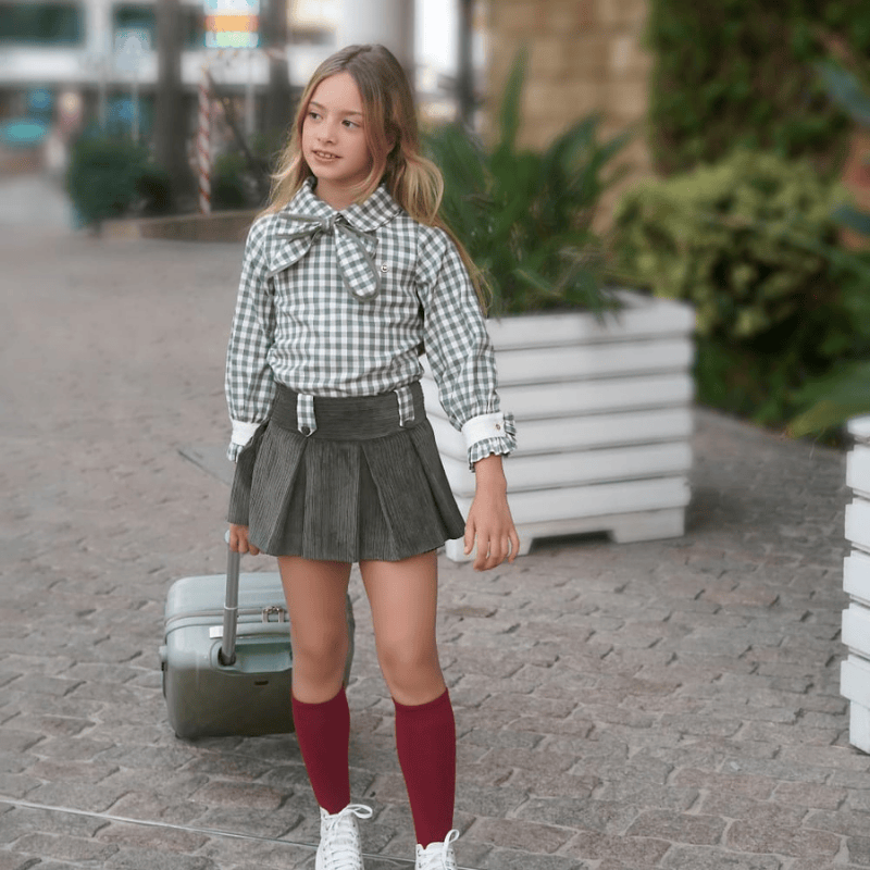 Conjunto blusa con falda-short Dafne Noma Fernández invierno. Este encantador conjunto de Noma Fernández combina elegancia clásica con detalles modernos, ideal para los días frescos de otoño e invierno. La blusa, confeccionada en un tejido de cuadros vichy en tonos verde bosque y blanco, presenta un patrón tradicional que evoca calidez y estilo. Su cuello adornado con lazada y los puños con ribete blanco aportan un toque refinado y dulce. La falda tipo short está realizada en pana verde oscuro, un tejido cálido y resistente perfecto para la temporada. Su corte plisado con trabillas decorativas y botón forrado a juego añade estructura y carácter al conjunto, manteniendo la comodidad sin renunciar al diseño. El contraste entre la textura suave de la blusa y la robustez de la pana crea un equilibrio visual encantador. Ideal para ocasiones especiales o para dar un aire distinguido al día a día, el modelo Dafne es una apuesta segura para las pequeñas fashionistas y es de la temporada otoño invierno de la firma Noma Fernández