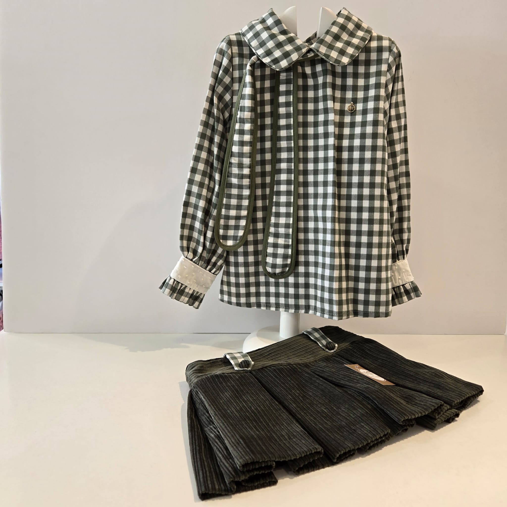 Conjunto blusa con falda-short Dafne Noma Fernández invierno. 🌿 Conjunto de blusa en cuadros vichy verde y falda-short en pana con tirantes. Diseño elegante y cálido, perfecto para la temporada otoño-invierno. Modelo Dafne de Noma Fernández.