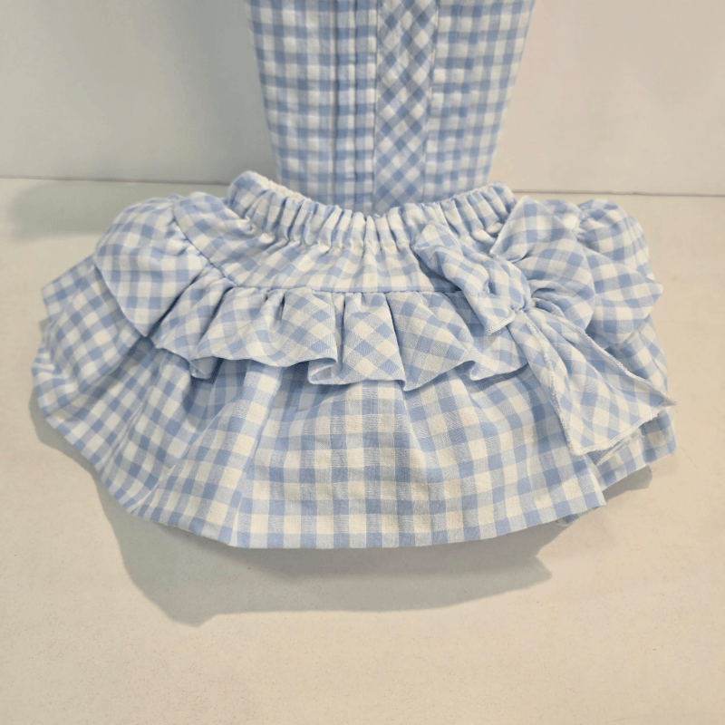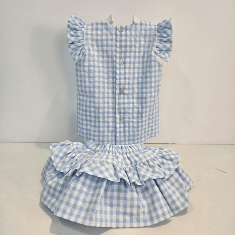 Este conjunto de Rahigo para primavera–verano es una pequeña joya en cuadro vichy celeste, pensado para las niñas que brillan con naturalidad. La blusa luce un diseño delicado con mangas de volante y espalda abotonada, confeccionada en un vichy suave y luminoso. La falda abombachada, con doble volante y caída ligera, aporta ese volumen juguetón tan característico de la firma. Completando el conjunto, la chaqueta de punto blanca añade un toque de elegancia: festoneada en puños y pechera, con una. Un conjunto que respira verano, dulzura y tradición, pensado para acompañar a tu pequeña en sus días más bonitos.