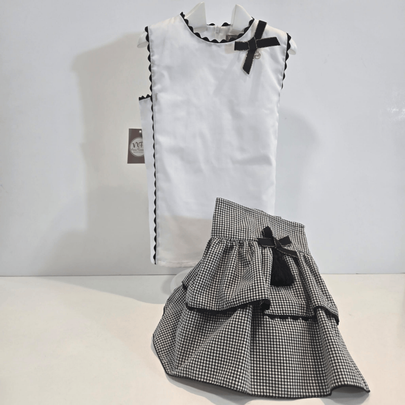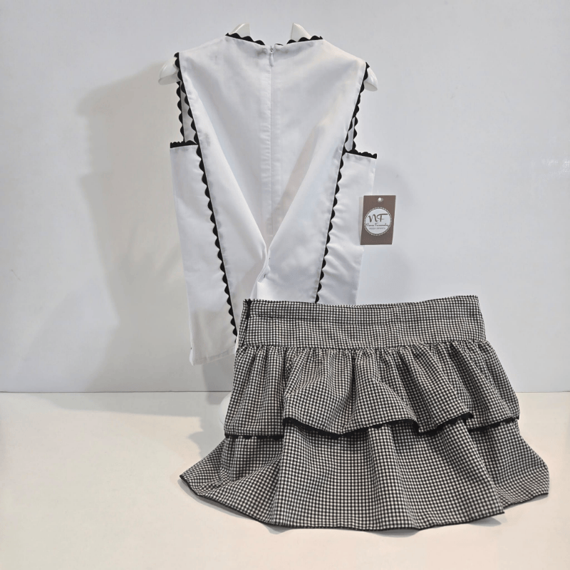 Conjunto blusa falda short colección Tejo primavera verano 26. Conjunto de blusa blanca y falda‑short vichy de la colección Tejo de la firma Noma Fernández. Detalles en negro, volantes y lazo decorativo coordinado. Un look elegante y fresco para la primavera–verano 2026. Jersey no incluido en el precio.