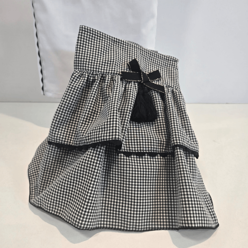 El conjunto de blusa y falda‑short de la colección Tejo de Noma Fernández es una propuesta exquisita para esta primavera–verano 2026, donde la elegancia clásica se une a un diseño fresco y muy actual. La blusa, en un blanco luminoso, destaca por sus delicados ribetes en negro que enmarcan la prenda con un contraste impecable. El detalle del lazo decorativo en el hombro aporta un toque distintivo y femenino, manteniendo la esencia refinada que caracteriza a la firma. La falda‑short, confeccionada en un vichy negro y blanco de aire tradicional, combina la estética de una falda con la comodidad del pantalón, ofreciendo libertad de movimiento sin perder estilo. Sus volantes estructurados y el lazo con borlas coordinado elevan el conjunto, creando un look armonioso y lleno de personalidad.
