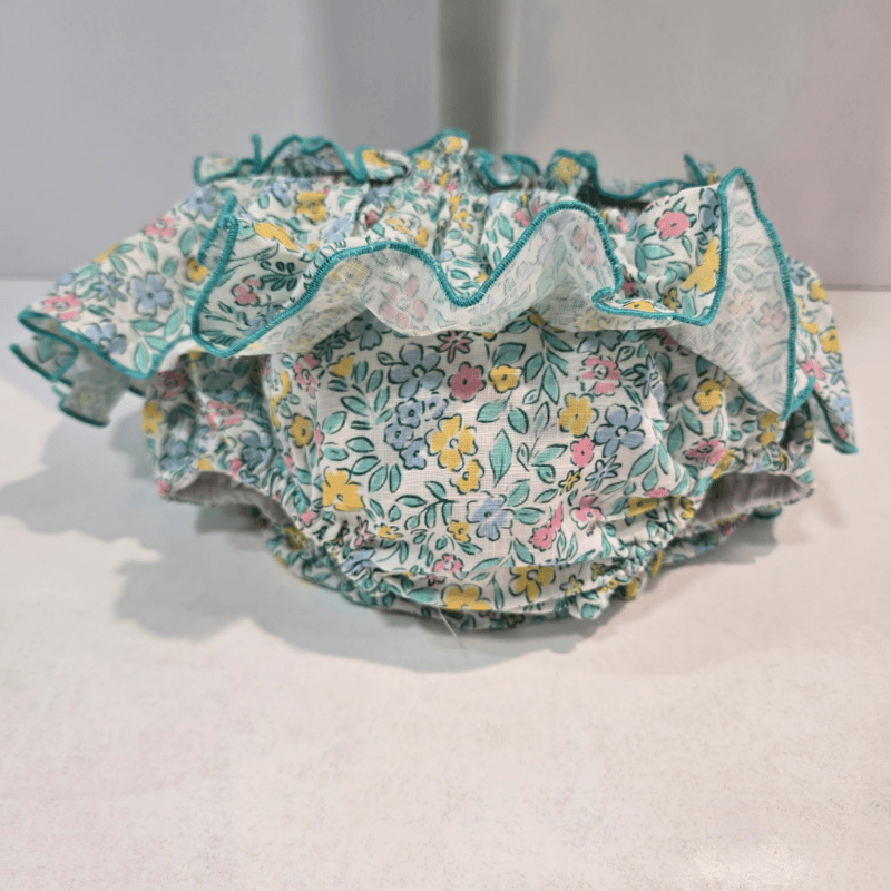 La acompaña una falda–short con estampado Liberty en tonos pastel —rosas, verdes, amarillos— que aporta movimiento, comodidad y un toque romántico inspirado en los jardines provenzales. El conjunto combina a la perfección la frescura del vichy con la delicadeza del Liberty, creando un look equilibrado, alegre y muy veraniego.