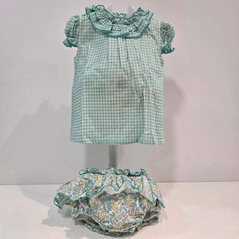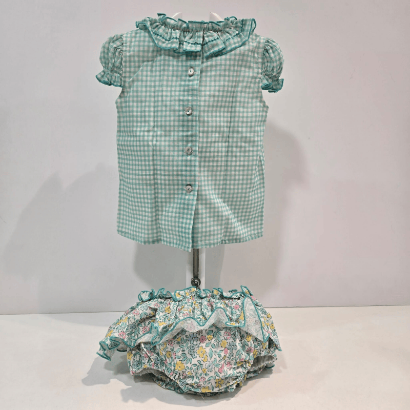 Conjunto blusa vichy/falda short Liberty la Provenza verano 26. Conjunto niña La Provenza de La Martinica: blusa vichy verde con botones de madera en forma de flor y falda–short Liberty en tonos pastel. Fresco, romántico y perfecto para primavera–verano 2026.