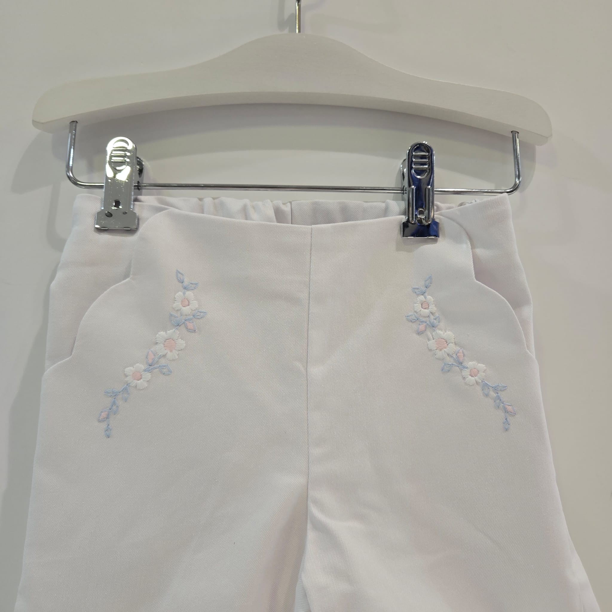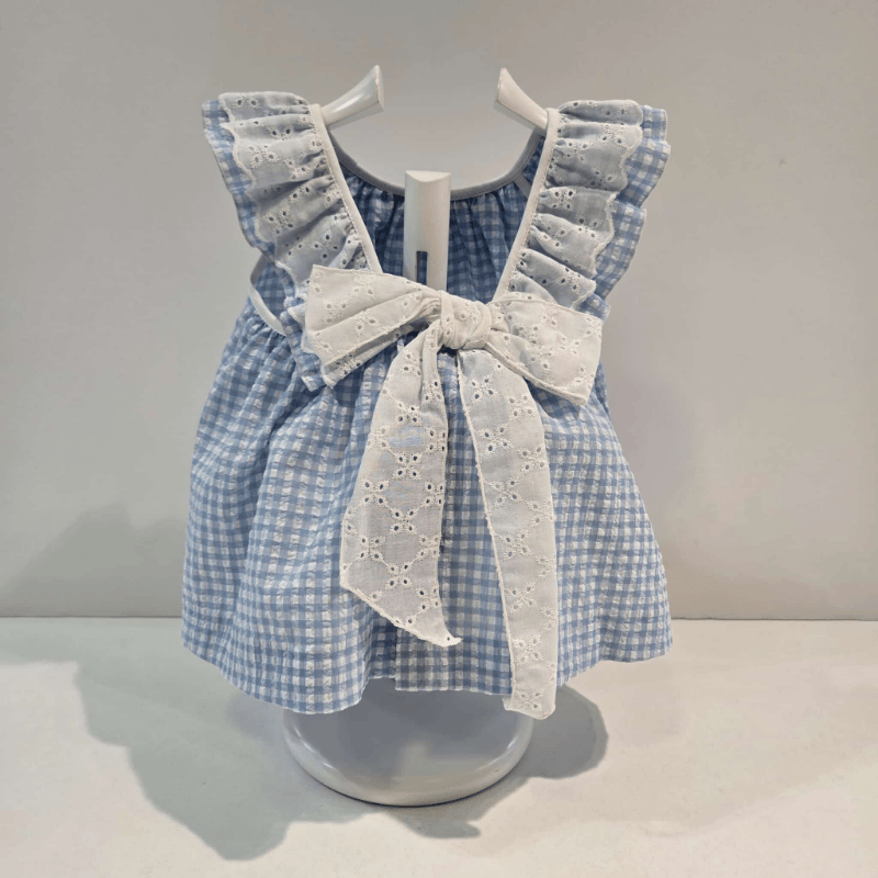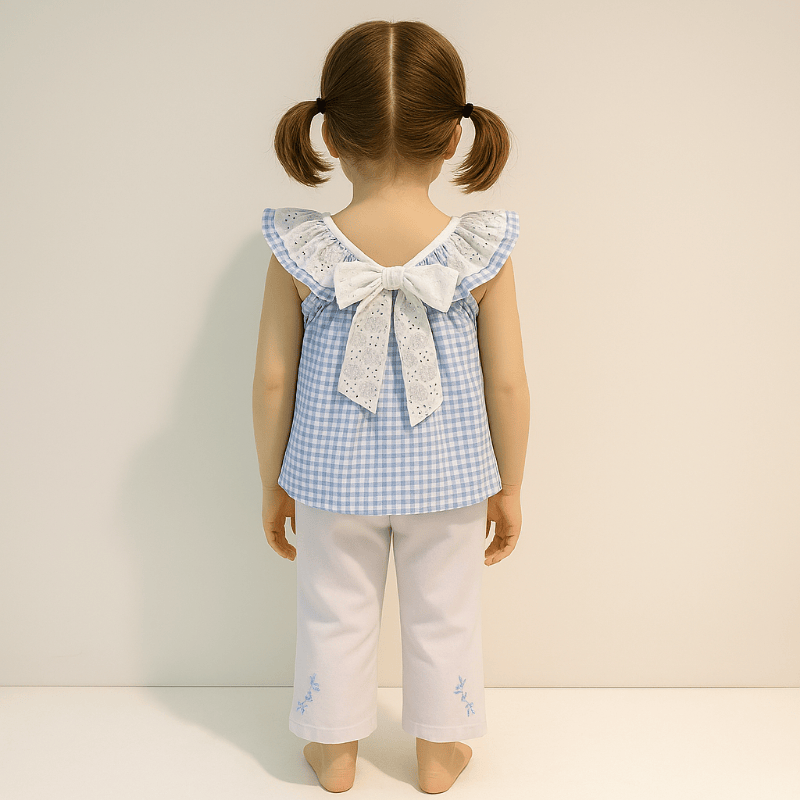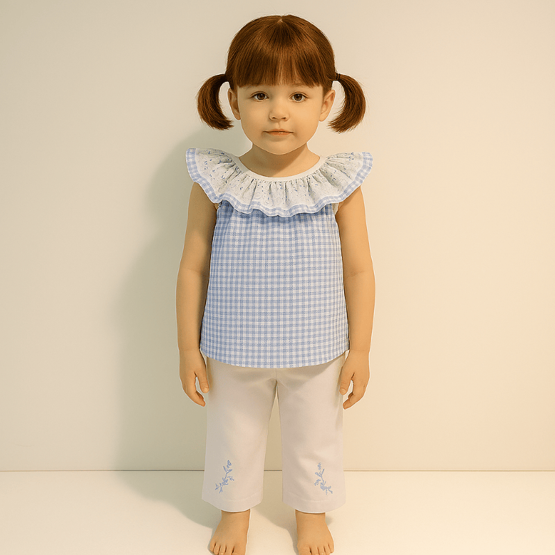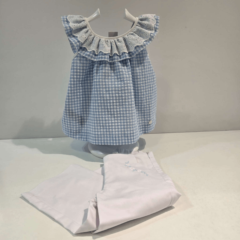 Conjunto blusa y pantalón niña Anade primavera verano Paz. Este conjunto primaveral combina delicadeza y comodidad en cada detalle. La blusa sin mangas, en clásico vichy azul y blanco, luce un amplio cuello de puntilla bordada que aporta un aire romántico y luminoso. El pantalón blanco roto, de tejido suave y ligero, está adornado con bordados florales en tonos azules que realzan su encanto. Diseñado para niñas de 12 a 36 meses, el conjunto se ajusta con naturalidad al cuerpo, respetando la proporción y caída de cada prenda. Perfecto para paseos, celebraciones o momentos especiales, este look transmite frescura, ternura y estilo. Recuerda que puedes verlo personalmente en Benidorm…Boutique Luna.