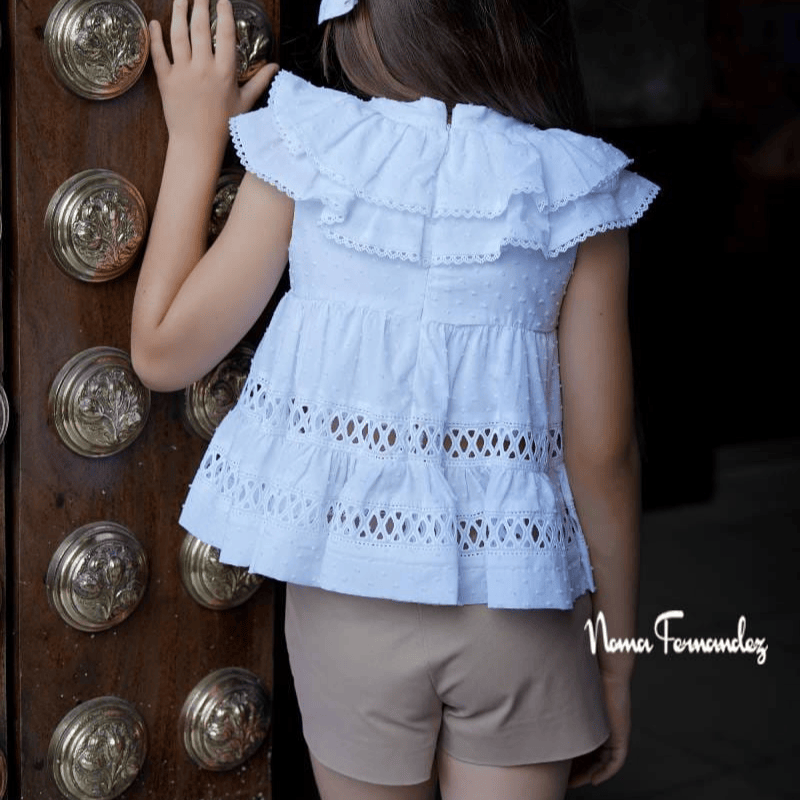 Conjunto blusón mas short colección Versalles Noma Fernández. Añade un toque de elegancia y frescura al guardarropa de tu pequeña con este encantador conjunto de la colección Versalles de Noma Fernández. Confeccionado en tela suave y ligera, este conjunto combina un blusón blanco sin mangas, con delicados detalles de encaje en los hombros, con bodoques por todo el cuerpo de la blusa que añade un toque de distinción. El short a juego, en color camel, presenta seis botones decorativos y un delicado encaje en el borde de la cintura, mas dos tiras en cada lado del frontal del short, aportando un estilo refinado y sofisticado y es una creación mas de Noma Fernández para esta colección primavera verano 2025