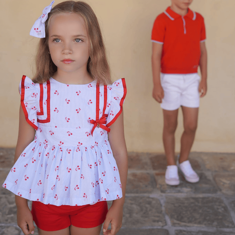 Un conjunto que huele a fruta fresca, a tardes azules y a risas que se escapan con el viento. Un verano entero bordado en cerecitas y rojo vivo.