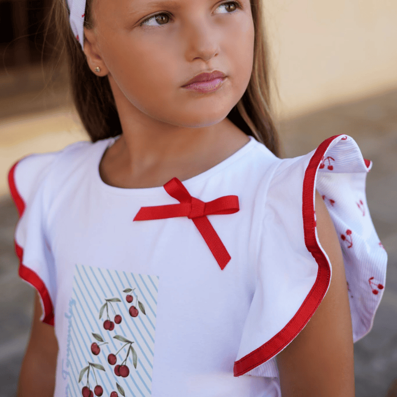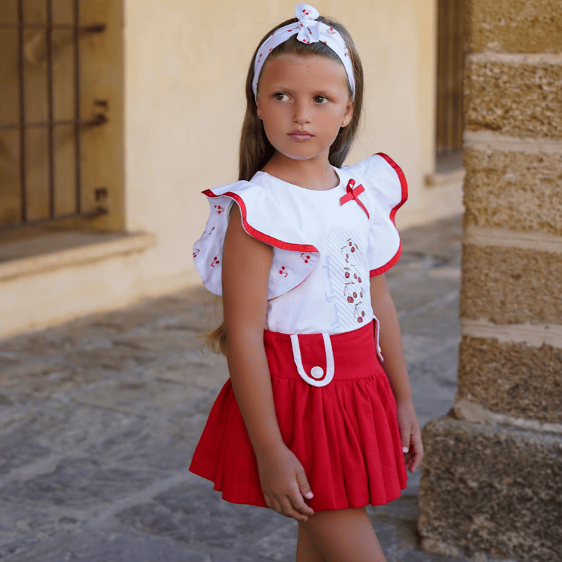 Un conjunto que sabe a cerezas dulces, a tardes largas y a risas que se quedan en el aire. Una pequeña fiesta en rojo y blanco que baila con el viento y guarda dentro la promesa de un verano inolvidable.