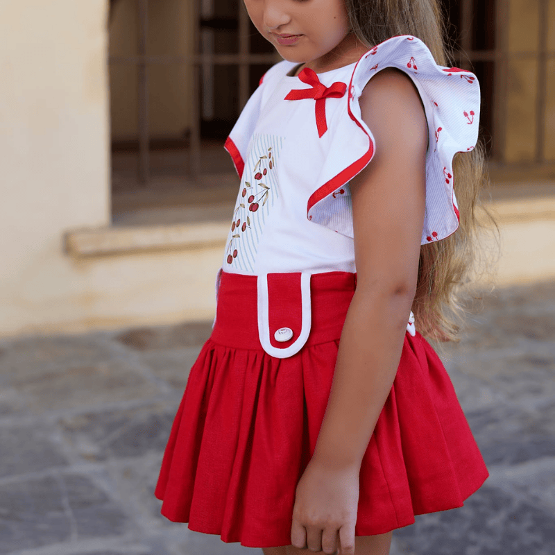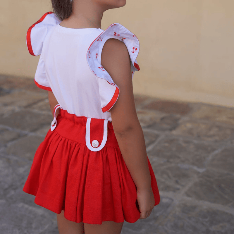 Conjunto Camiseta manga volante y falda colección aliso verano. Conjunto de camiseta blanca con volantes y cerecitas bordadas, combinado con falda roja de vuelo y botones blancos. Diseño fresco, elegante y veraniego de la colección Aliso de Noma Fernández.