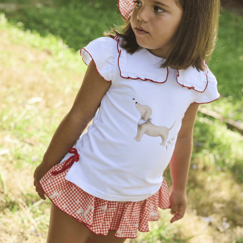Este conjunto de la colección Scooby de La Martinica es una pequeña escena de verano hecha prenda. La camiseta, blanca como una nube de algodón, luce un transfer de perrito que parece estar oliendo una aventura. El cuello con volante y su ribete rojo aportan ese aire juguetón y coqueto que tanto nos enamora en la temporada estival.