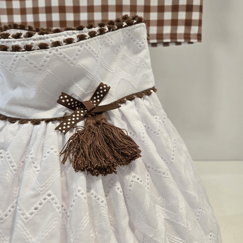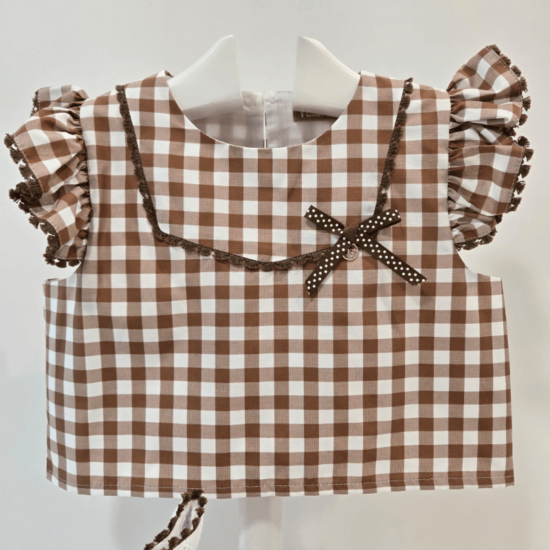Conjunto de top con falda colección Tilo Noma verano 26. El conjunto de la colección Tilo de Noma Fernández combina la frescura del verano con la elegancia artesanal que caracteriza a la firma. El top, confeccionado en un cuadro vichy camel y blanco, presenta un diseño encantador con volantes en los hombros, remates cuidados y un pequeño lazo frontal que aporta ese toque dulce y distintivo. Su patrón cómodo y su tejido ligero lo convierten en una prenda ideal para los días cálidos. La falda, en blanco luminoso, está realizada en un tejido bordado de dibujo geométrico, con detalles en camel que armonizan a la perfección con el top. El cinturón con borlas camel añade movimiento y un aire delicado, creando un conjunto equilibrado, fresco y lleno de encanto. Una propuesta perfecta para paseos, celebraciones o cualquier ocasión especial de esta primavera–verano 2026, donde la comodidad y la belleza se encuentran sin esfuerzo. Un conjunto que baila con la brisa, que ilumina cada paso y que guarda en sus detalles la magia suave del verano.