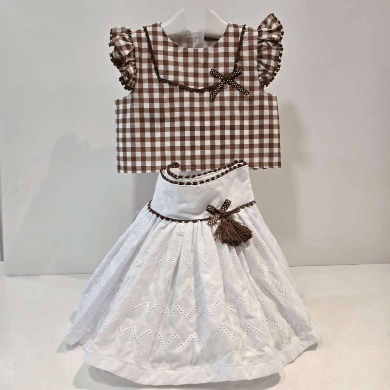 Conjunto de top con falda colección Tilo Noma verano 26. Conjunto Tilo de Noma Fernández con top de cuadro vichy camel y falda blanca bordada con detalles en camel. Fresco, cómodo y lleno de encanto para esta primavera–verano.