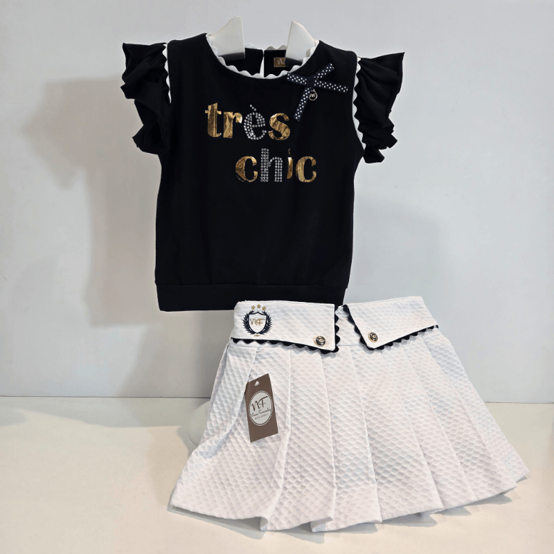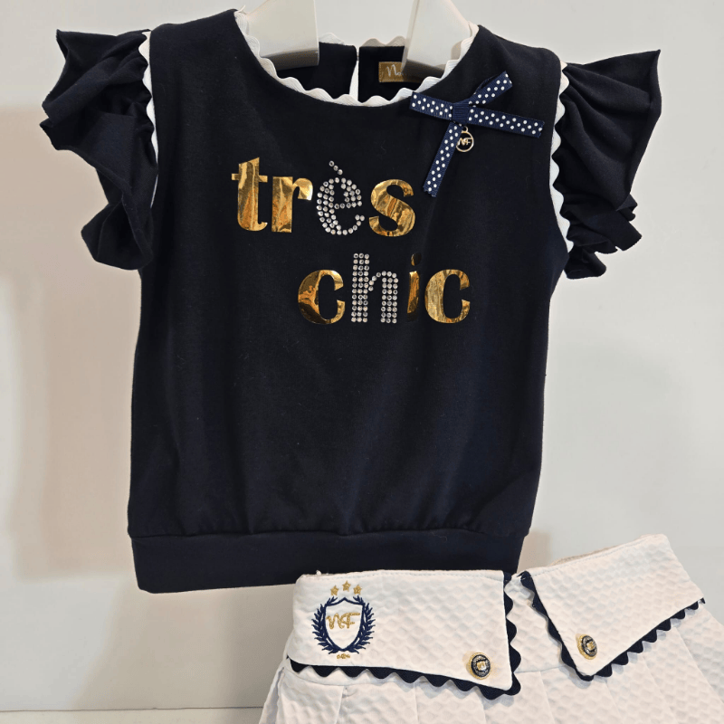 Conjunto de falda–short en piqué blanco y camiseta azul marino con estampado transfer “très chic”. Prenda fresca, cómoda y elegante para la temporada primavera–verano, de la firma Noma Fernández.