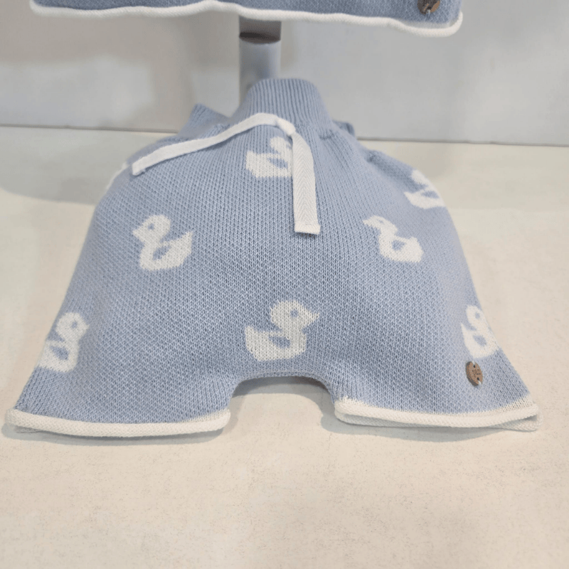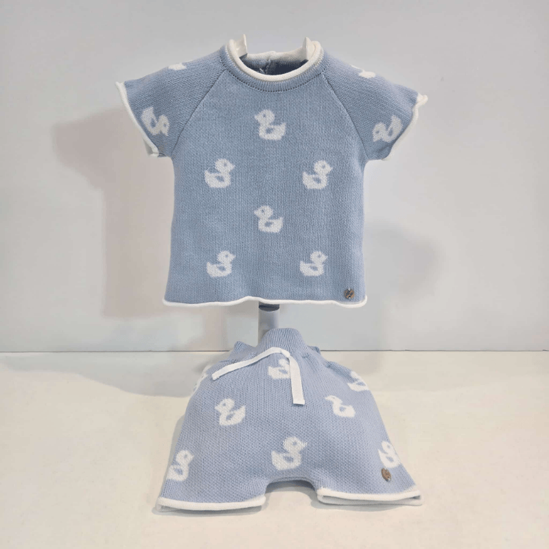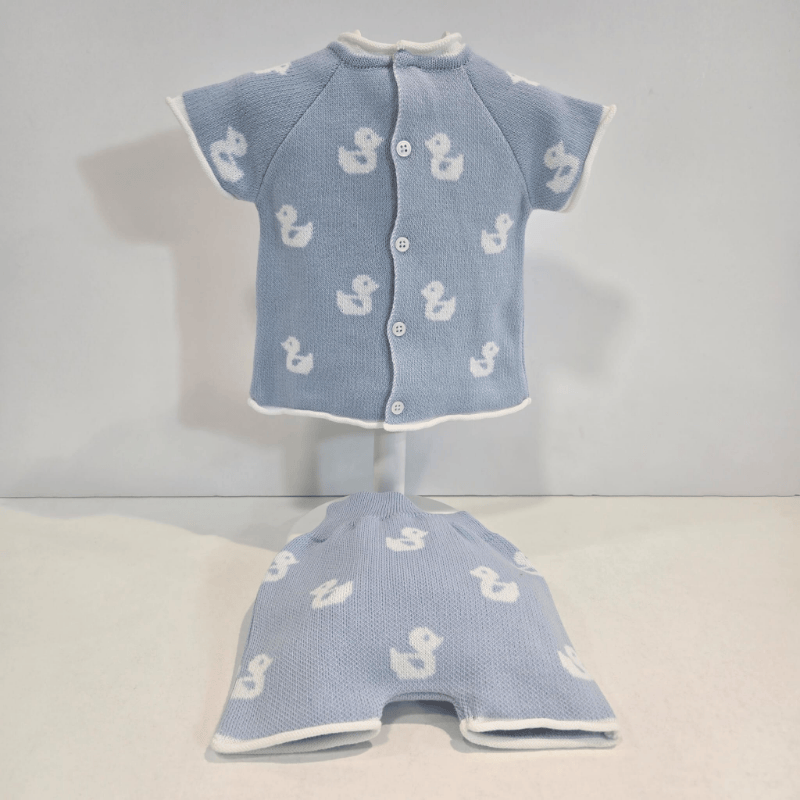 Este encantador conjunto de la colección Patitos de Paz Rodríguez viste al pequeño con la dulzura del azul cielo y la suavidad del punto veraniego. El jersey de manga corta luce un delicado dibujo de patitos blancos que aporta un aire tierno y juguetón, acompañado de remates blancos en cuello y mangas que iluminan el diseño.