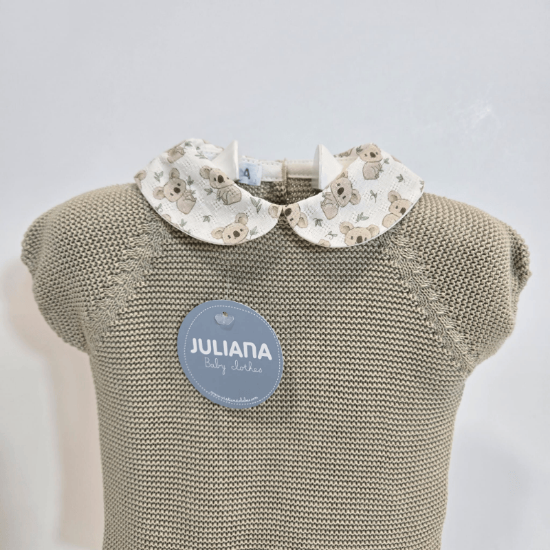 Este conjunto de verano para bebé une la suavidad del punto con la frescura de la tela estampada, creando una prenda tan cómoda como encantadora. El jersey, confeccionado en punto ligero y transpirable, luce un delicado cuello bebé con estampado de koalas que aporta un toque divertido y tierno. Su diseño de manga corta lo convierte en una opción ideal para los días cálidos, manteniendo al pequeño fresco sin renunciar al estilo. Un conjunto perfecto para disfrutar del verano con dulzura, comodidad y ese encanto inconfundible de Juliana.