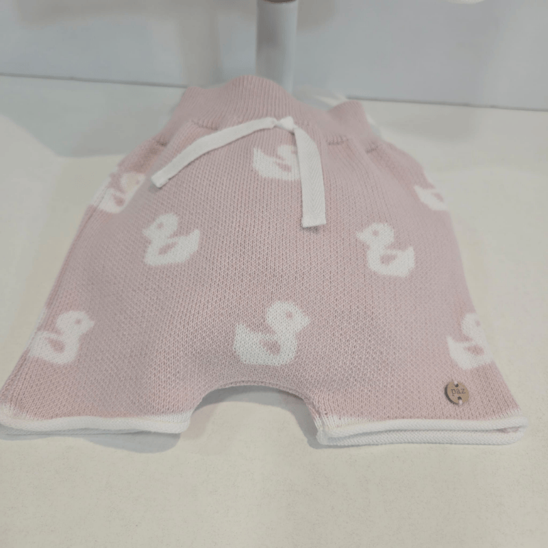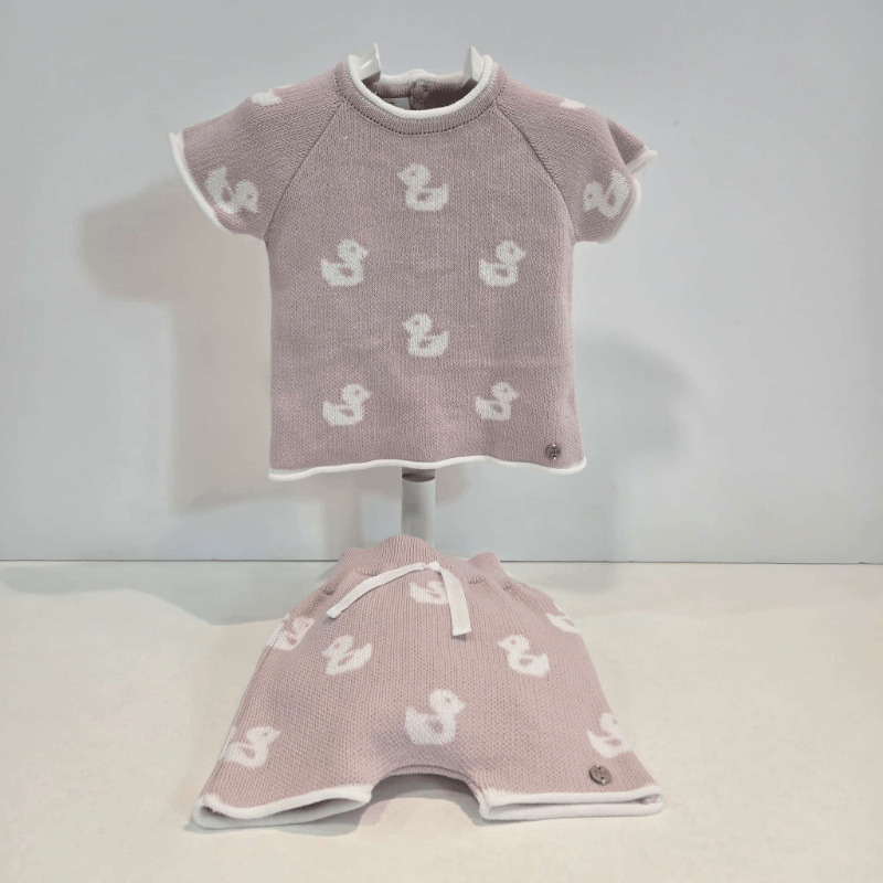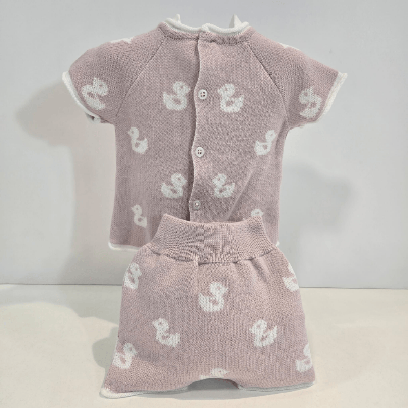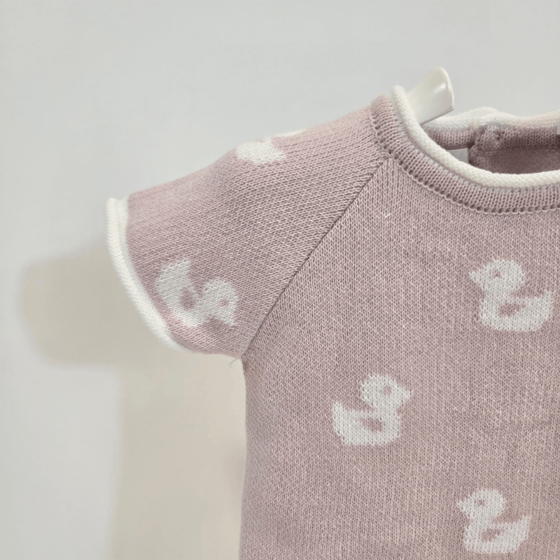 Conjunto jubón con pantalón magnolia niña patitos verano. Conjunto de niña para primavera–verano formado por jubón de punto suave en tono magnolia con detalle de patitos y pantalón a juego con cordón decorativo. Una propuesta fresca, dulce y cómoda, perfecta para los días luminosos de la temporada.