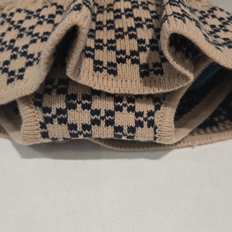 Conjunto niña dos piezas: jersey y falda. Corte recto y vuelo, tejido de punto con patrón geométrico camel y negro.