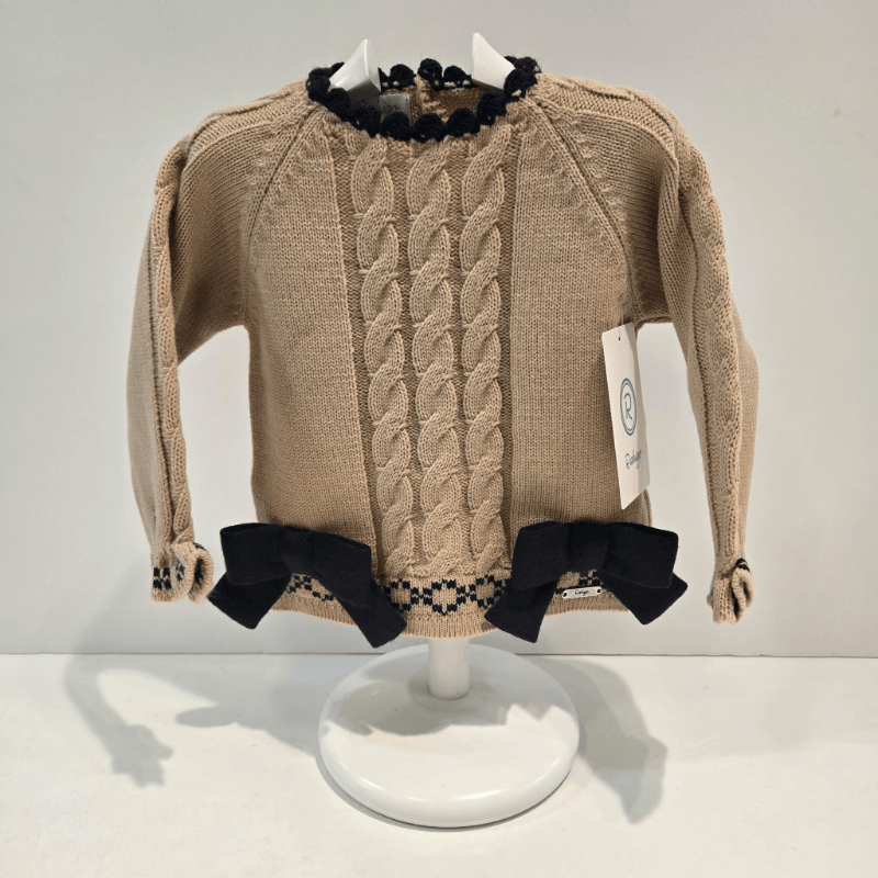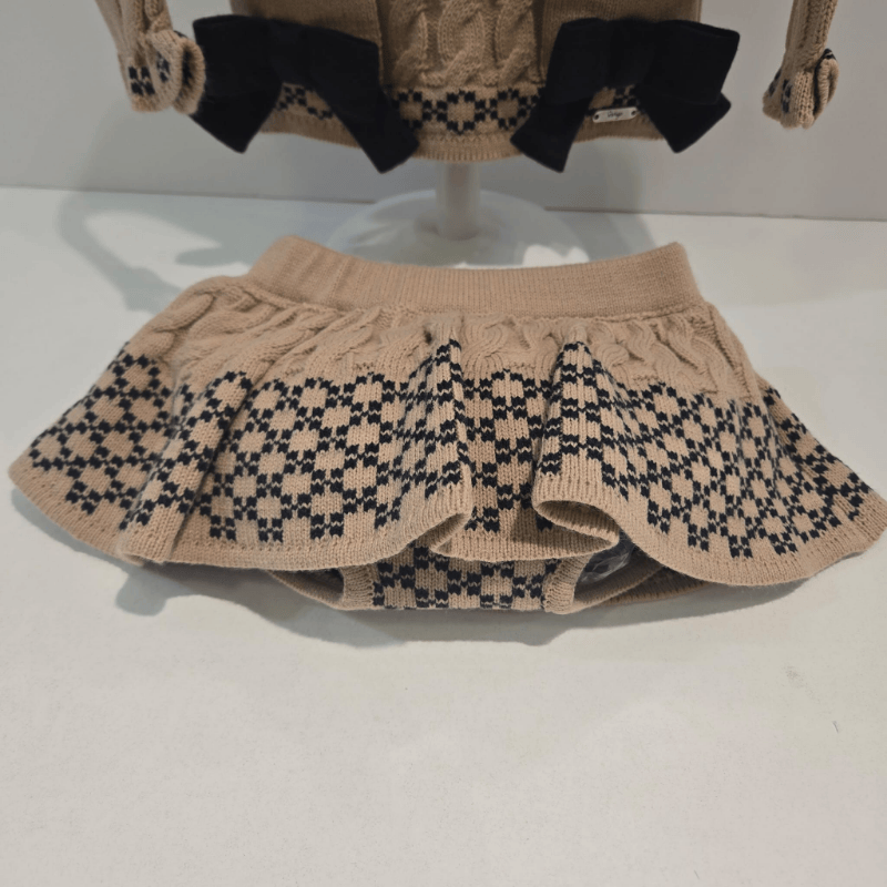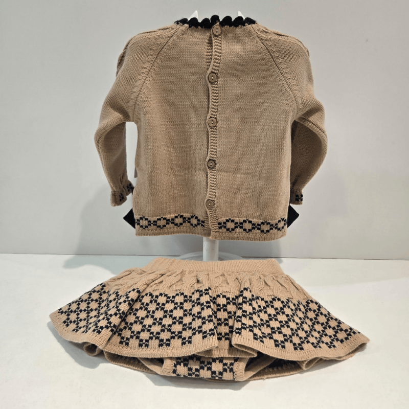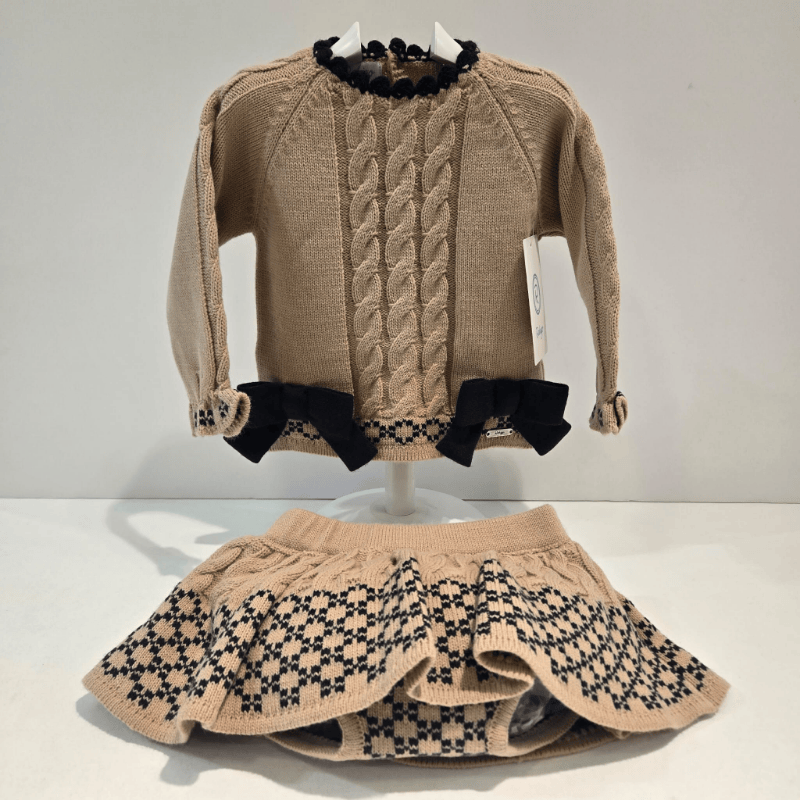 Conjunto de niña de la colección camel y negro de Rahigo para la temporada invierno 2025/26. Incluye jersey de punto con corte recto y detalles de canalé, decorado con lazo y cenefa geométrica en contraste. La falda, de vuelo suave y estructura plisada, repite el patrón en camel y negro, creando un conjunto armonioso y elegante. El tejido cálido y flexible aporta comodidad sin perder estilo, ideal para los días fríos con encanto. Un diseño que combina tradición y modernidad en cada puntada. Disponible en Boutique Luna, donde cada prenda se elige con cariño y atención al detalle.