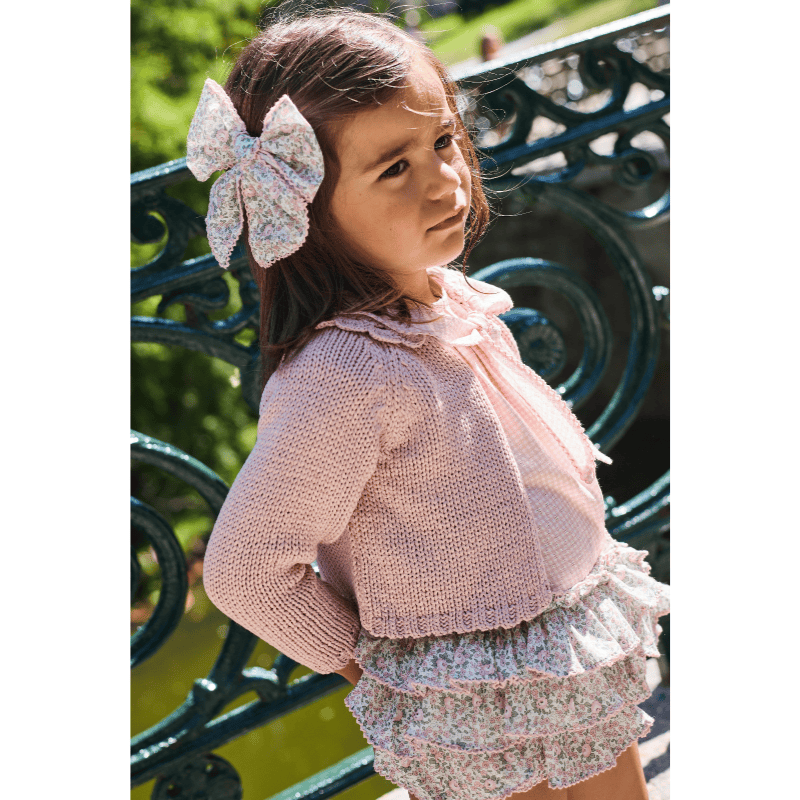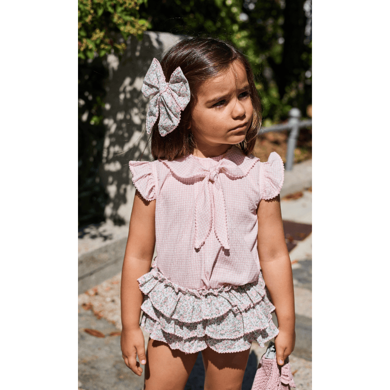 Conjunto niña con braguita cup cake primavera verano 26. Conjunto Cup Cake de La Martinica: camiseta rosa con volantes y lazo, y braguita floral con volantes. Dulce, cómodo y perfecto para la primavera–verano.