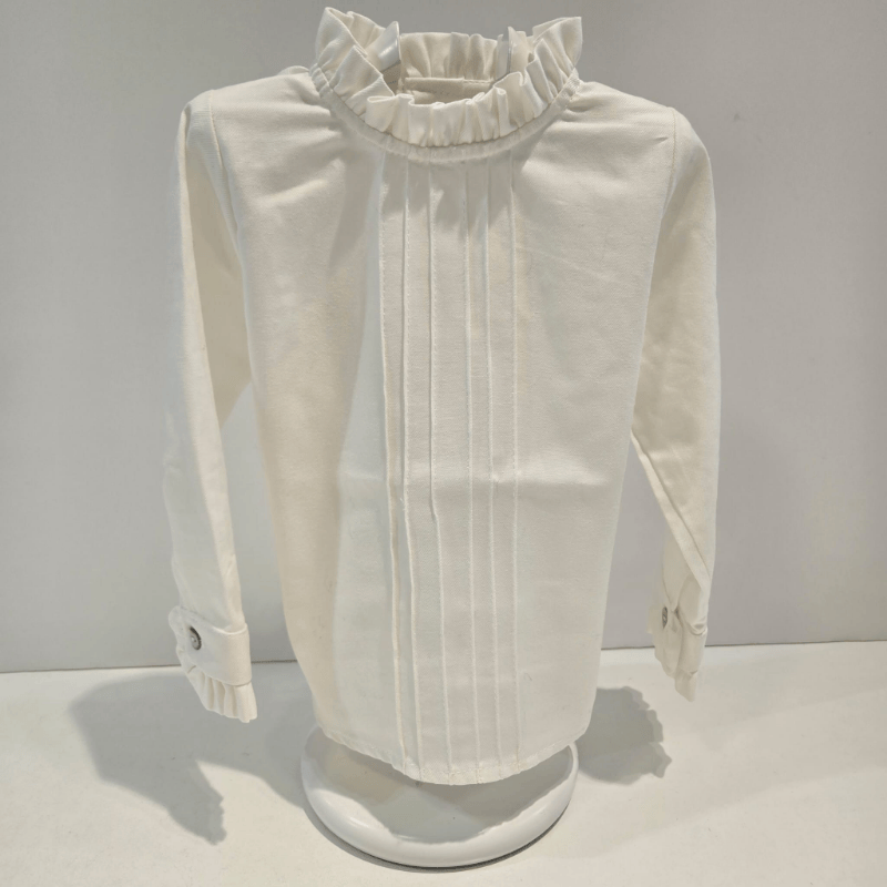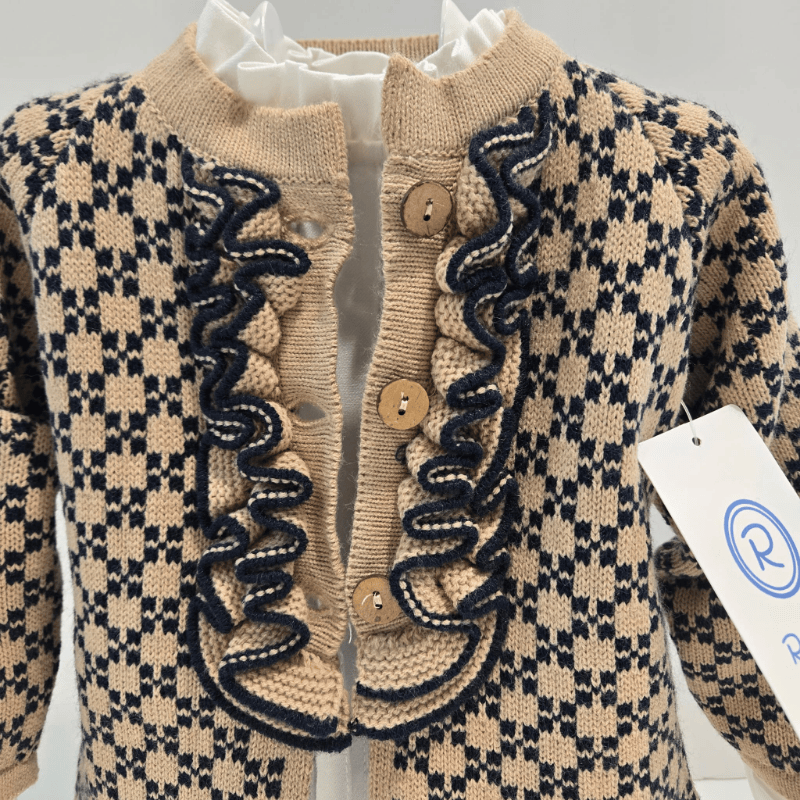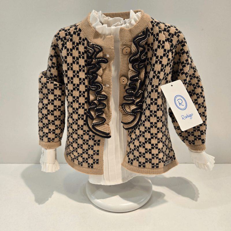 Conjunto de niña de tres piezas de la firma Rahigo, colección Chorreras, diseñado para la temporada otoño-invierno. Incluye camisa blanca con cuello rizado, falda plisada y short interior, todo en armonía de azul marino y camel. El patrón geométrico cruzado aporta carácter al tejido, mientras que el corte estructurado de la chaqueta con volantes verticales realza la silueta infantil con gracia. Ideal para ocasiones especiales o paseos otoñales, este diseño combina tradición y modernidad con el sello inconfundible de Rahigo. Disponible en Boutique Luna, donde cada prenda cuenta una historia de estilo y ternura.
