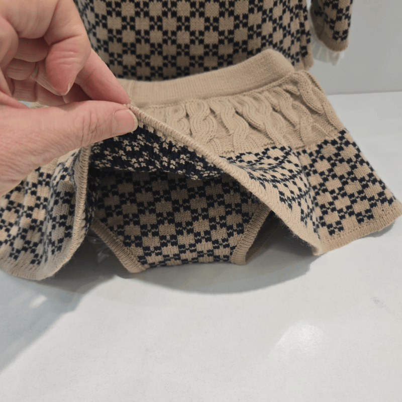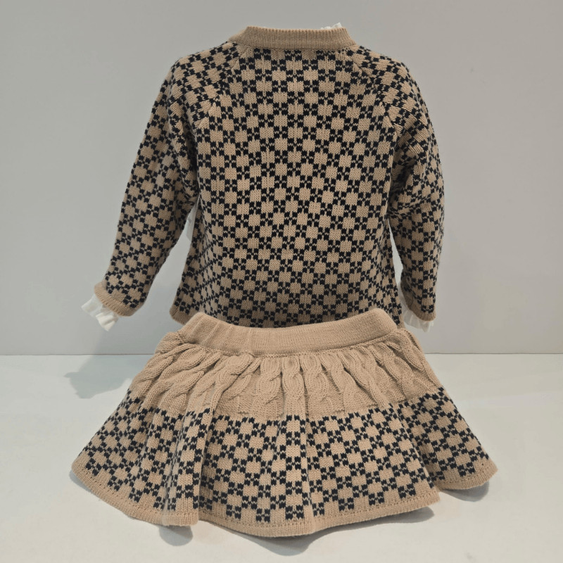 Conjunto Rahigo de tres piezas en azul marino y camel. Corte estructurado con patrón geométrico cruzado. Elegancia otoñal para niñas con estilo.