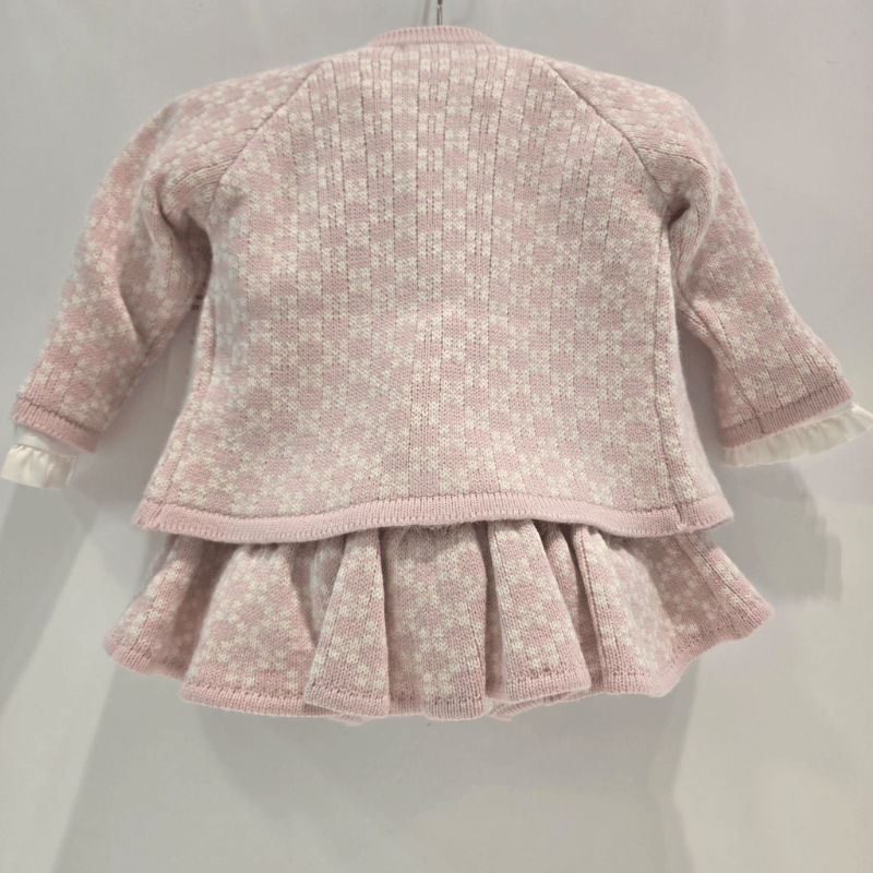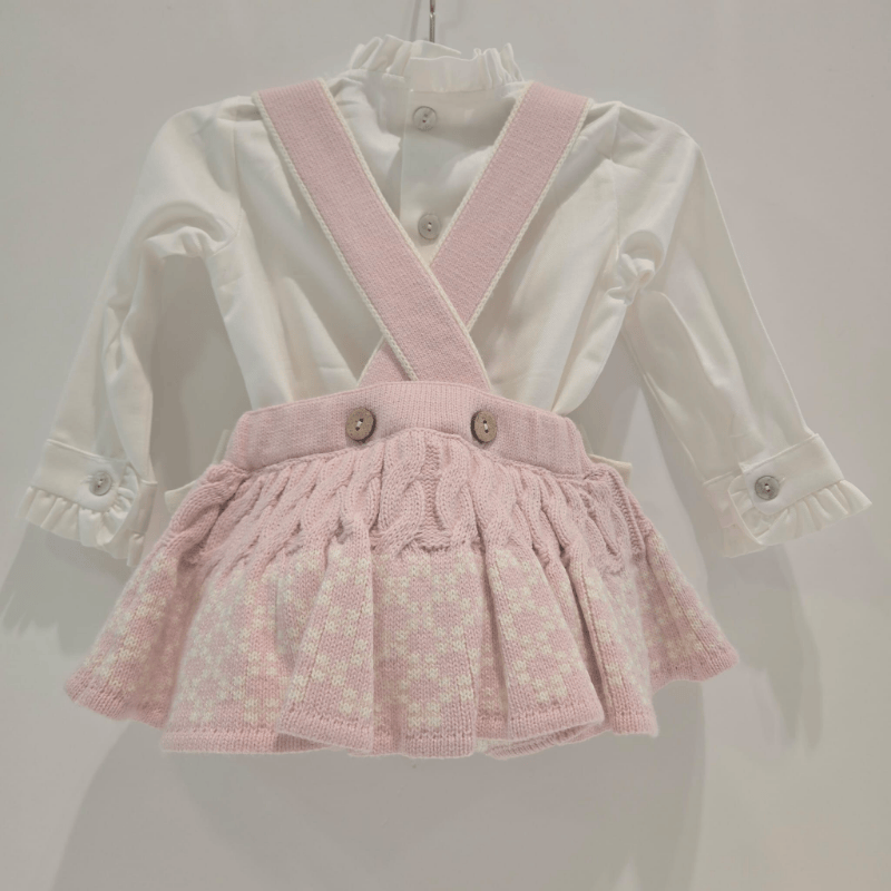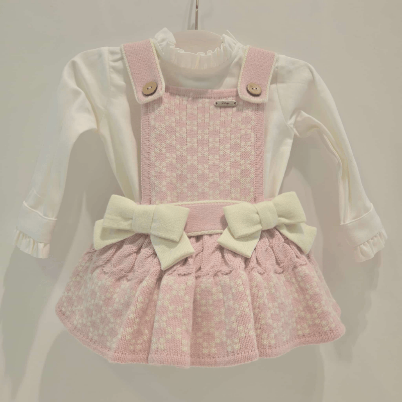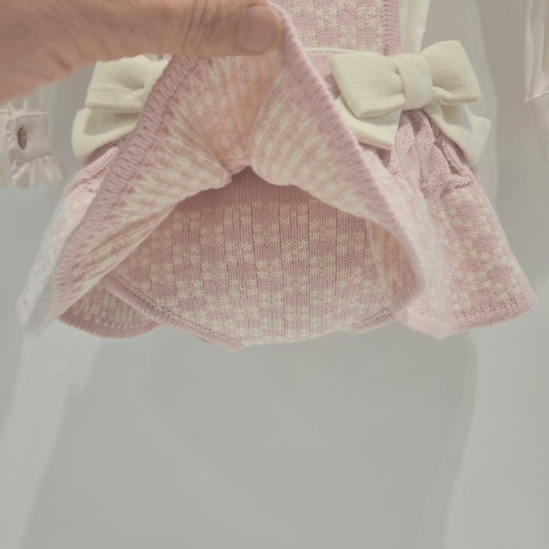 Delicadeza y encanto en cada detalle: este conjunto de blusa, pichi y chaqueta para niña combina un corte clásico con un patrón tejido en cuadros suaves, logrando una silueta dulce y estructurada. La blusa blanca, de cuello alto y puños fruncidos, aporta elegancia atemporal, mientras que el pichi rosa con textura de punto y grandes lazos decorativos en la cintura añade volumen y ternura. Los tirantes con botones de madera completan el diseño con un toque artesanal. Ideal para los días frescos de otoño e invierno, este modelo refleja el estilo cuidado que caracteriza a Boutique Luna, donde cada prenda se elige con mimo y poesía.