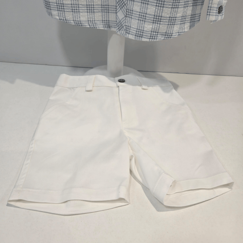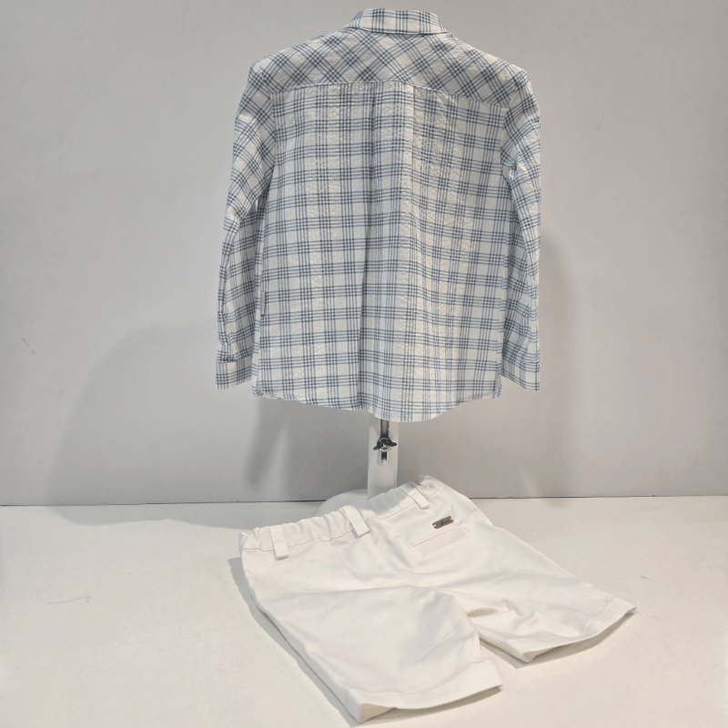 Conjunto niño camisa cuadros y pantalón blanco verano. Conjunto para niño de Marín Aranda con camisa de cuadros azul y blanco y pantalón corto blanco. Un look fresco, elegante y perfecto para los días especiales de primavera y verano.