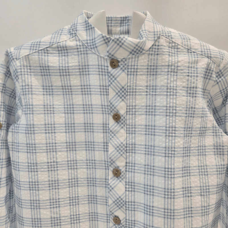 Este conjunto para niño de Marín Aranda es una apuesta segura para la temporada primavera–verano. La camisa, confeccionada en un tejido ligero con un precioso cuadro azul y blanco, presenta cuello mao y botones en tono madera que aportan un toque clásico y muy cuidado. Combina a la perfección con el pantalón corto blanco, de corte limpio y elegante, con trabillas y cierre frontal para un ajuste cómodo y estiloso. Un conjunto ideal para celebraciones, paseos y momentos especiales, donde la comodidad y la elegancia se unen en un look impecable. Camisa de cuadros azul y blanco Cuello mao y botones en tono madera Manga larga con puño abotonado. Pantalón corto blanco con trabillas Cierre frontal con botón Diseño fresco y elegante para primavera–verano