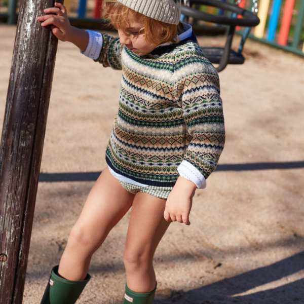 Conjunto niño de la colección musgo con camisa blanca y pantalón de cuadro Vichy el pantalón tiene engomado por detrás para ajustarse al cuerpecito y presenta dos bolsillos con botones de madera, recuerda que en la sección complementos puedes llevarte el jersey a juego de punto con grecas en tricolor perfecto para este conjunto y para otras prendas de la misma familia, una prenda más que es de la nueva colección otoño invierno 2024/25 de La Martinica