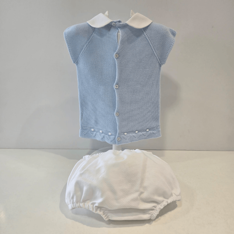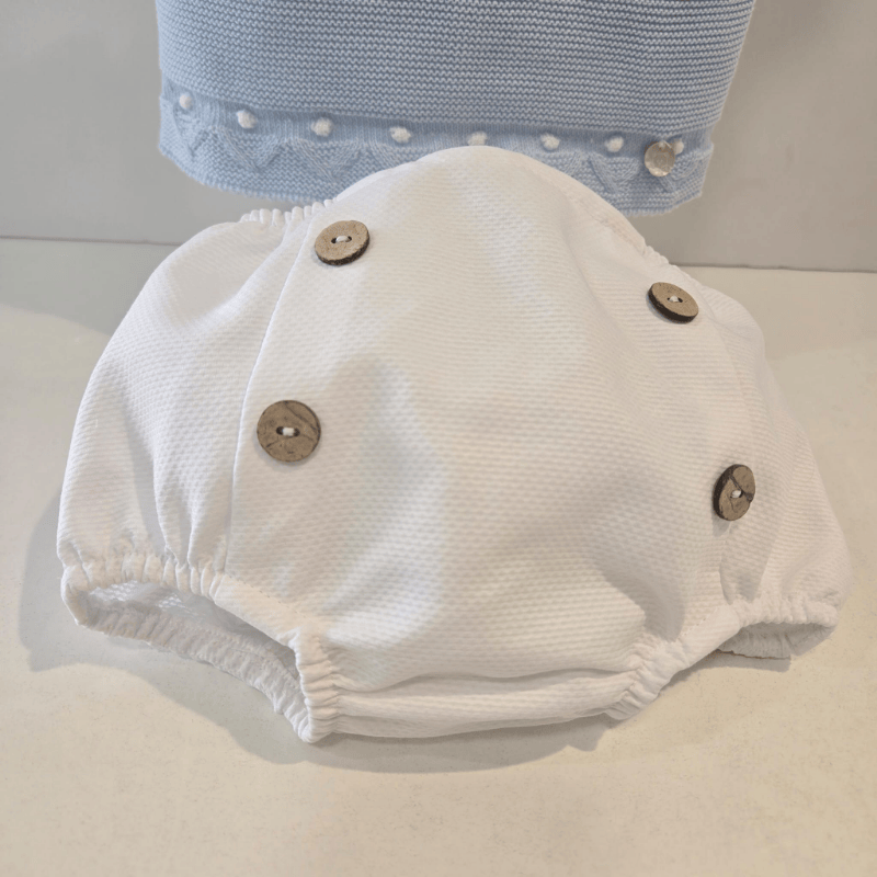 Este conjunto de Pangasa para niño combina la suavidad del punto azul con la pureza del piqué blanco, creando un look clásico, fresco y muy favorecedor para los días cálidos. El jersey, tejido con un azul suave y luminoso, incorpora un cuello de piqué blanco que aporta un toque tradicional y elegante. El detalle de los pequeños adornos en el bajo y el charm metálico añaden personalidad sin perder la delicadeza característica de la firma. La braguita tipo ranita, confeccionada en piqué blanco de textura suave, presenta botones decorativos en la parte delantera que completan el conjunto con equilibrio y encanto. Su ajuste cómodo y su volumen redondito permiten libertad de movimiento y un acabado impecable. Un conjunto ligero, dulce y perfecto para los primeros meses de primavera y verano. Un diseño que mezcla azul cielo y blanco puro, como un día claro que empieza suave y promete momentos inolvidables.