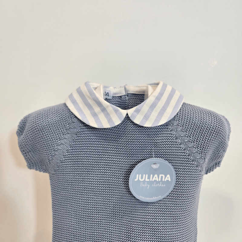 Este conjunto para niño de Juliana combina la frescura del punto con la elegancia ligera de las rayas estivales. El jubón, tejido en un azul nube suave —un tono limpio, sereno y muy propio de la temporada— presenta manga corta, textura delicada y un cuello bebé en tela blanca con finas rayas azuladas que aportan un aire clásico y pulido. El acabado impecable del punto y la armonía del cuello crean una pieza equilibrada y luminosa.