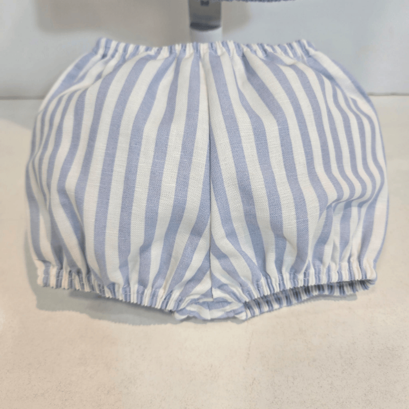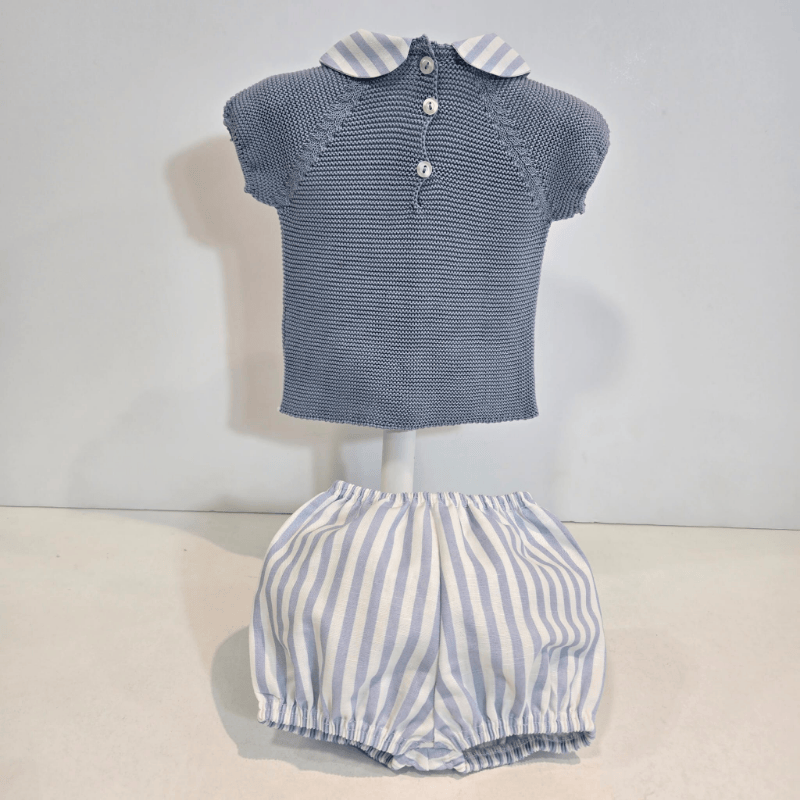 Conjunto niño Jubón punto y pantalón en tela rayas verano. Conjunto de Juliana con jubón de punto en azul nube suave y cuello a rayas. Incluye pantalón de tela con rayas blancas y azules. Fresco, elegante y perfecto para primavera–verano.