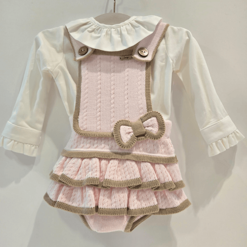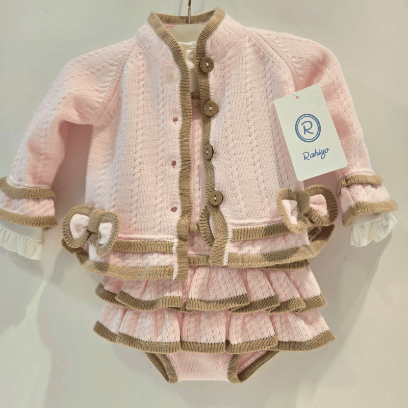 Conjunto de tres piezas Rahigo otoño-invierno 2025/26: chaqueta de punto rosa con lazos, blusa blanca con volantes y ranita con volantes ribeteados. Tejido suave, corte cómodo y diseño artesanal. Ideal para bebés de 6 a 18 meses.