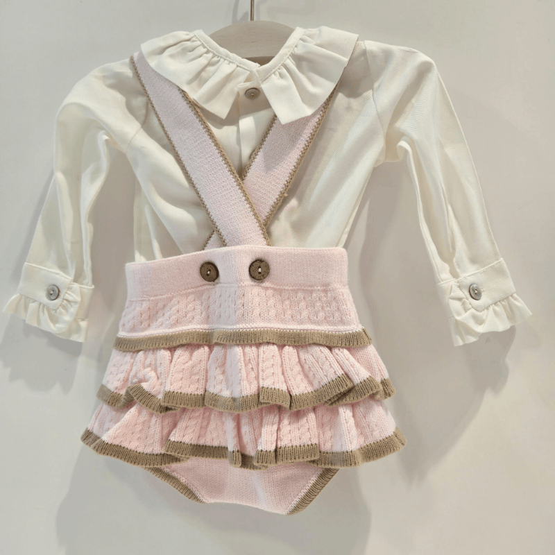 Descubre la elegancia atemporal del conjunto de ranita, blusa y chaqueta de la firma española Rahigo, diseñado para la temporada otoño-invierno 2025/26. Este modelo combina tradición y sofisticación en cada detalle, ideal para vestir a tu peque con estilo en los días más frescos. La chaqueta de punto rosa empolvado con ribetes beige presenta un patrón trenzado delicado, confeccionado en tejido acrílico suave y cálido. Su corte recto con cuello redondo y cierre frontal con botones decorativos aporta comodidad y un aire clásico. Dos lazos frontales añaden un toque romántico y elegancia atemporal. La blusa interior, con cuello fruncido y puños con volante, está confeccionada en algodón blanco, aportando frescura y contraste al conjunto. La ranita tipo falda pantalón incluye tres volantes con ribete beige, creando un efecto de capas que añade volumen y movimiento. El diseño incorpora braguita interior para mayor funcionalidad y ajuste perfecto. Disponible en tallas desde 6 hasta 18 meses. Una pieza exclusiva de Rahigo que refleja el cuidado artesanal y la elegancia infantil.