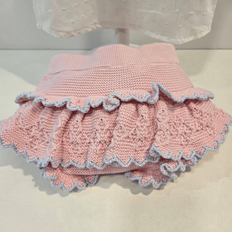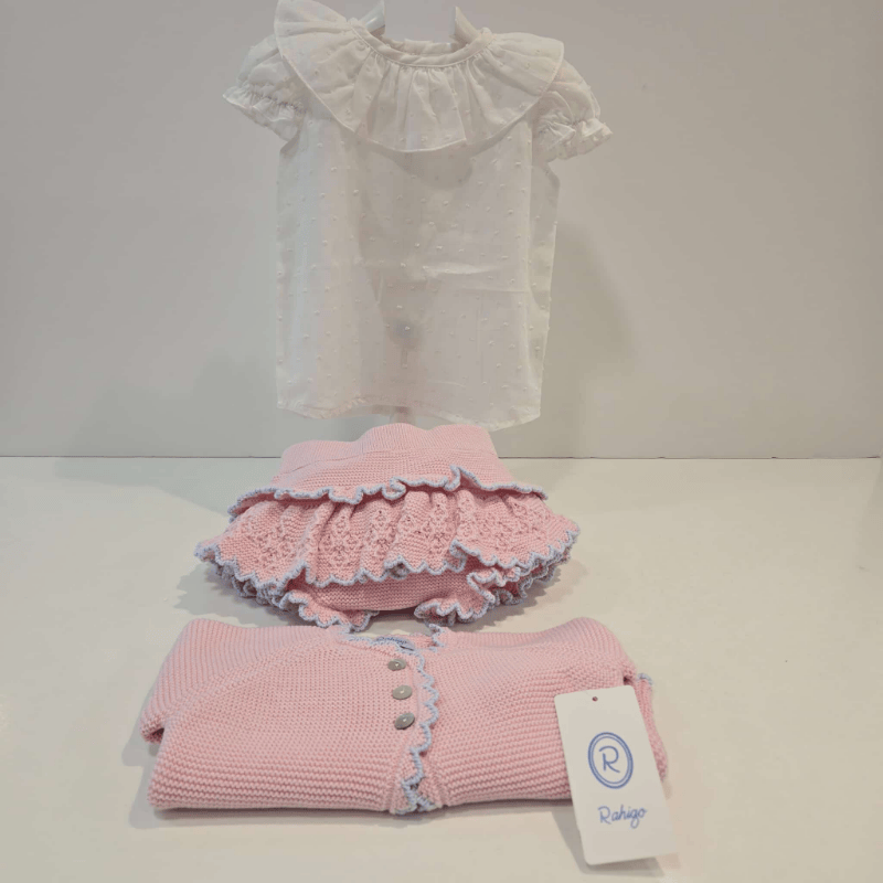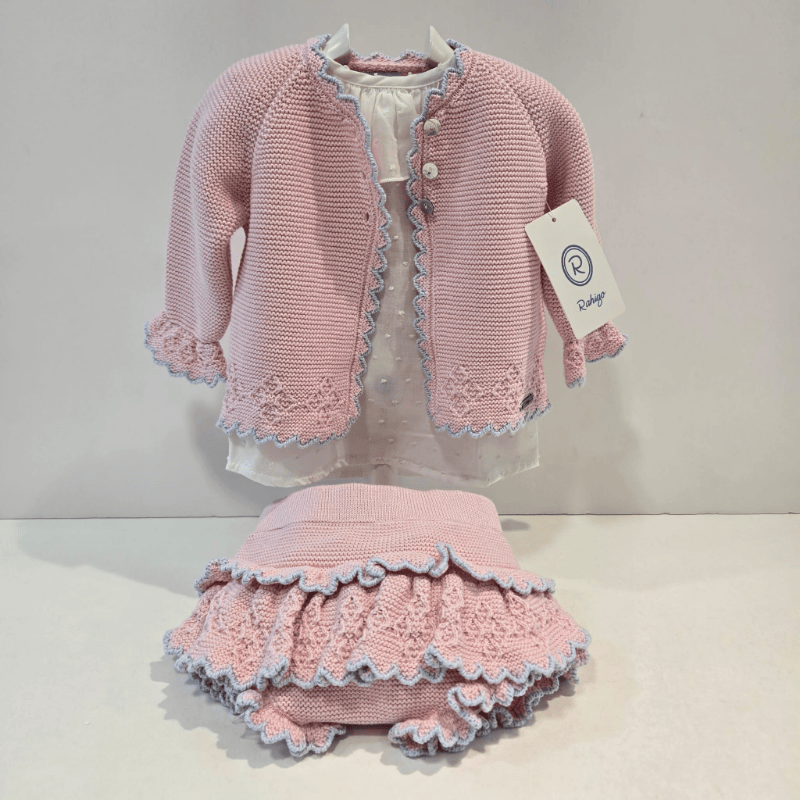 Conjunto set de 3 piezas rosa-azul Rahigo primavera. Un conjunto de tres piezas que resume a la perfección el encanto artesanal de Rahigo para primavera–verano. La chaqueta luce un punto suave con relieves delicados que aportan volumen y un acabado muy trabajado. El ribete rizado en mangas, bajo y abertura frontal dibuja un movimiento ondulado que enmarca toda la prenda con un aire coqueto y fresco. La botonera de nácar, ligeramente tornasolada, añade ese toque clásico y luminoso que solo el nácar auténtico consigue. La camisa, ligera y dulce, presenta un cuello redondo con remate rizado y unas mangas suaves que mantienen la misma línea de delicadeza. El tejido respira, acompaña y equilibra el punto de la chaqueta sin restarle protagonismo. La braga a juego, en los mismos tonos rosa y azul, completa el conjunto con un ajuste cómodo y un diseño pensado para lucir sin esfuerzo.