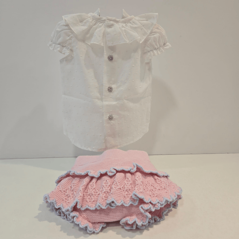 Un conjunto que parece tejido entre nubes rosadas y brisas azules, perfecto para vestir ternura sin renunciar al detalle.
