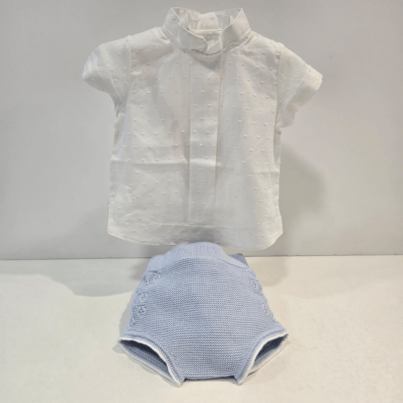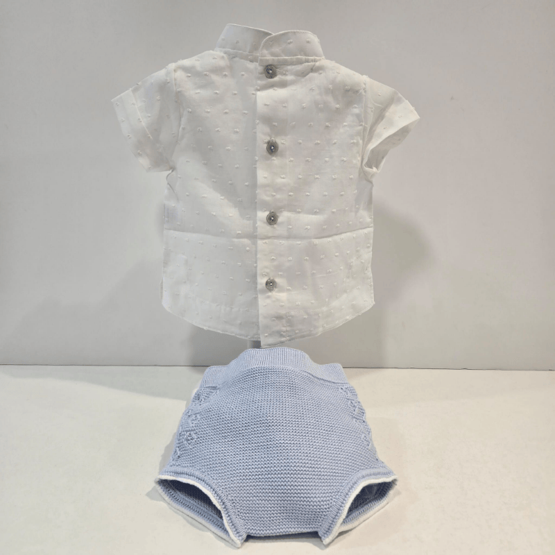 Conjunto set tres piezas niño Rahigo primavera verano. Conjunto de tres piezas de Rahigo: camisa ligera, pantalón corto cómodo y chaqueta de punto artesanal. Dulce, fresco y perfecto para la temporada primavera–verano.