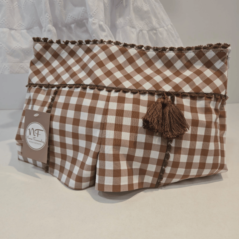 Conjunto Short colección Tilo de Noma primavera-verano 2026. Conjunto Tilo de Noma Fernández formado por blusa calada con detalles en negro y short de cuadro vichy marrón. Fresco, cómodo y lleno de encanto para esta primavera–verano. Sencillo, luminoso y tan dulce como un día de sol.