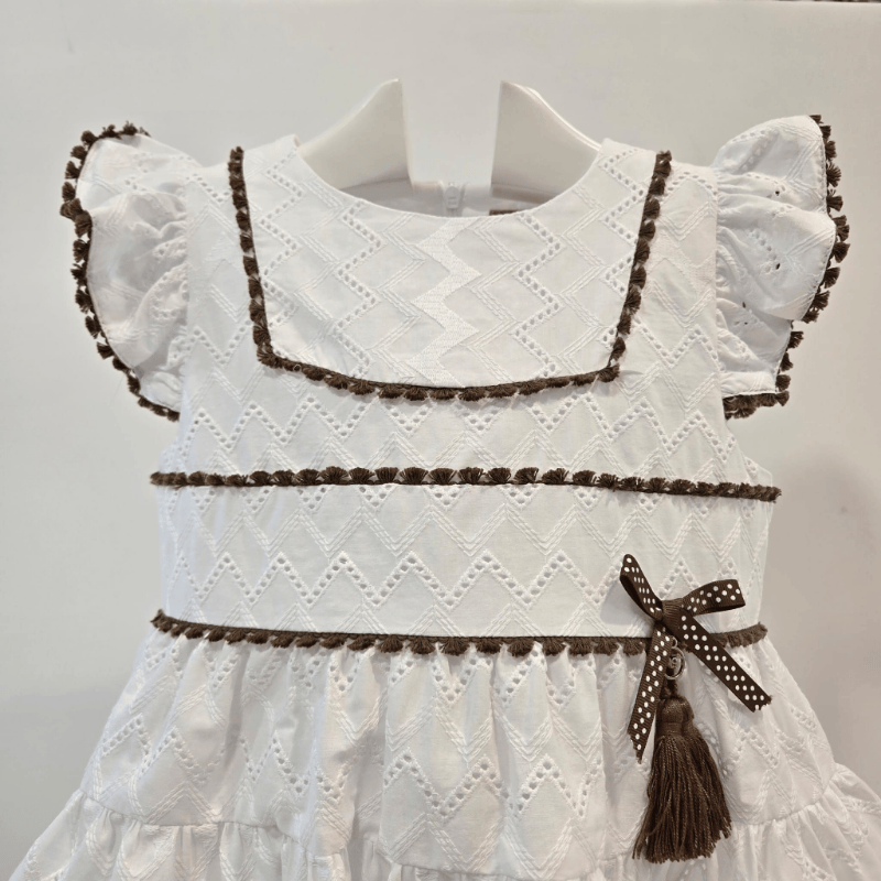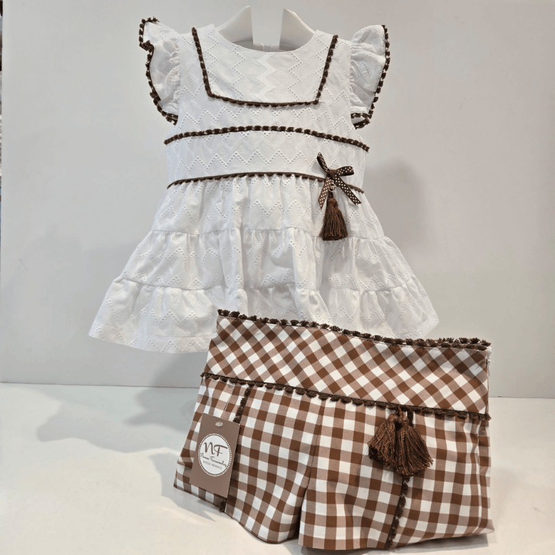 Conjunto Short colección Tilo de Noma primavera-verano 2026. El conjunto de blusa y short Tilo de Noma Fernández es una de esas propuestas que capturan la esencia del verano: luz, frescura y un equilibrio perfecto entre dulzura y estilo. La blusa, confeccionada en un tejido calado de dibujo geométrico, presenta un diseño impecable con volantes en las mangas, remates en vivo negro y un delicado detalle de lazo con borlas en cintura que aporta movimiento y carácter. Su corte cómodo y su aire artesanal la convierten en una pieza especial para los días cálidos. El short, en cuadro vichy marrón y blanco, completa el conjunto con un contraste encantador y muy propio de la firma. Su patrón favorecedor y su tejido suave permiten libertad de movimiento sin perder elegancia. Un conjunto pensado para niñas que disfrutan del verano con estilo, perfecto para paseos, celebraciones o cualquier ocasión donde la comodidad y la belleza se den la mano.