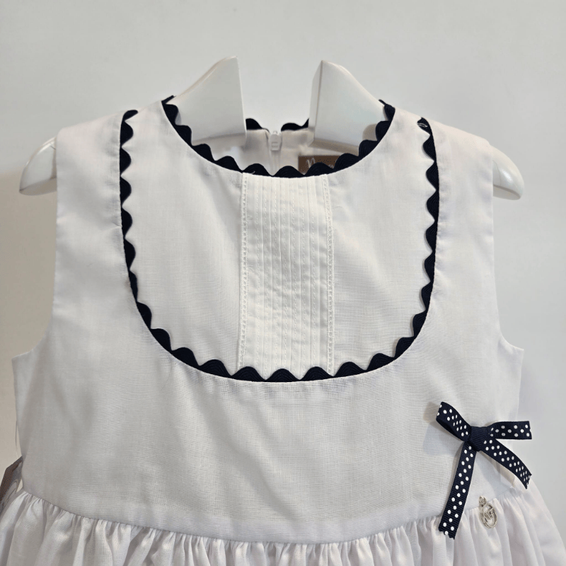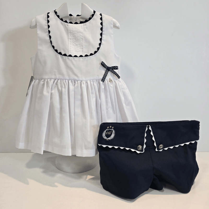 El conjunto de short y blusón de la colección Olmo de Noma Fernández es una propuesta fresca, elegante y llena de carácter para la temporada primavera–verano. Diseñado en la icónica combinación azul marino y blanco, mantiene la esencia marinera y refinada que define a la colección, aportando un aire luminoso y atemporal. El blusón, de corte suave y ligero, destaca por su caída delicada y su diseño pensado para ofrecer comodidad sin renunciar a la elegancia. El short, perfectamente coordinado, aporta un toque dinámico y versátil, ideal para niñas que disfrutan de prendas cómodas pero con estilo. Juntos forman un conjunto equilibrado, fácil de llevar y perfecto tanto para el día a día como para ocasiones especiales de verano. Una propuesta que combina tradición, frescura y ese sello inconfundible de Noma Fernández que convierte cada prenda en un pequeño tesoro de temporada.