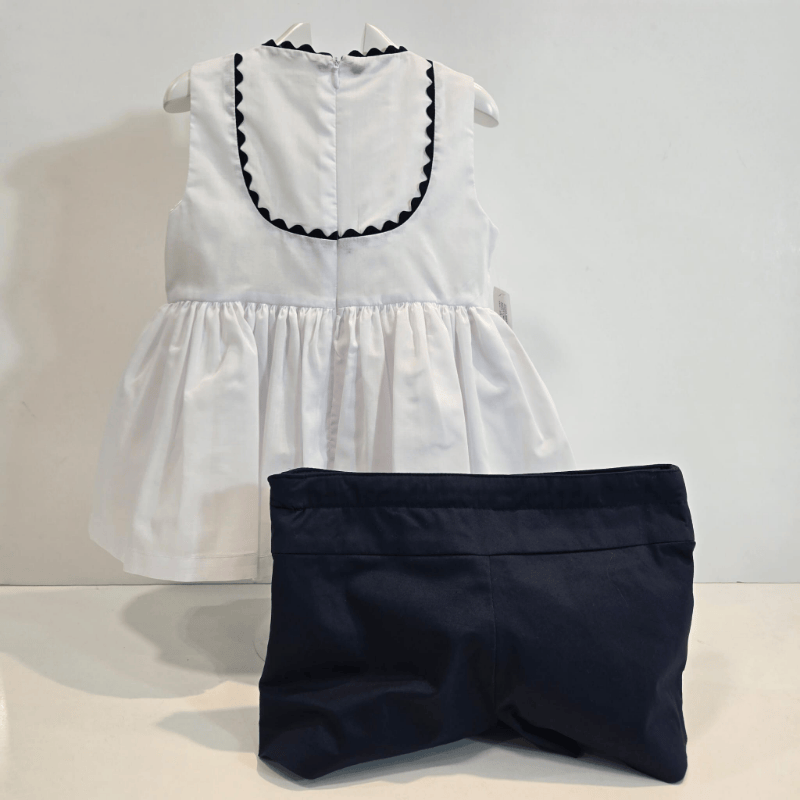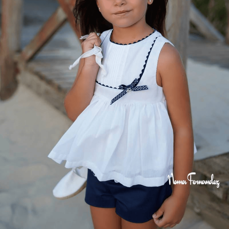 Conjunto short mas blusón niña colección olmo primavera verano. Conjunto de short y blusón para niña de la colección Olmo de Noma Fernández, en azul marino y blanco. Una propuesta fresca, elegante y cómoda para primavera–verano, perfecta para niñas que buscan estilo, calidad y libertad de movimiento.