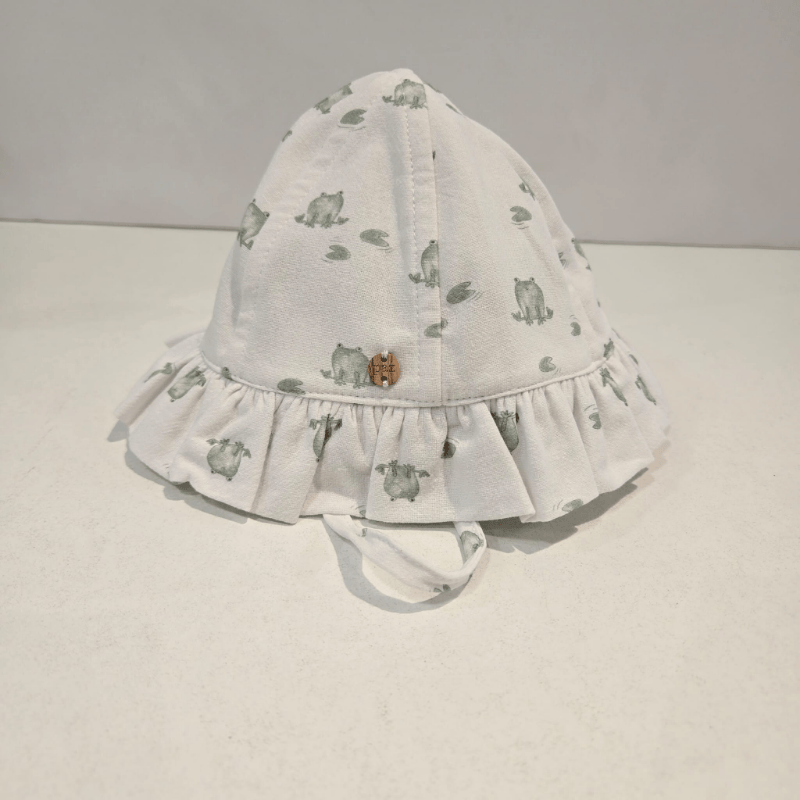 Gorrito algodón estampado croac croac primavera verano. Gorrito de algodón estampado de la colección Croac Croac de Paz Rodríguez. Ligero, suave y perfecto para proteger con estilo en primavera y verano.