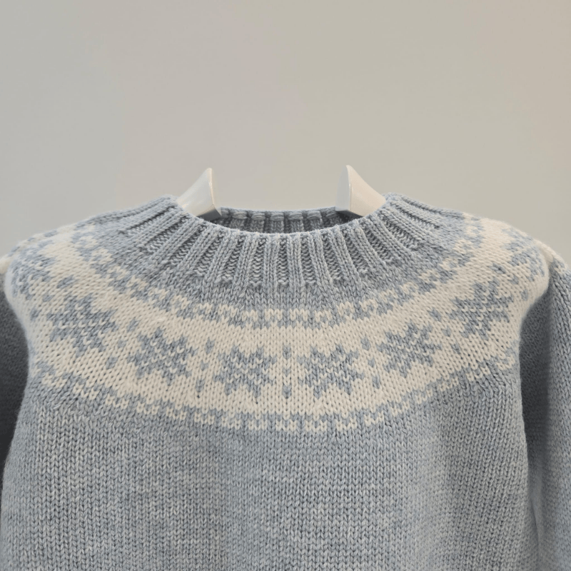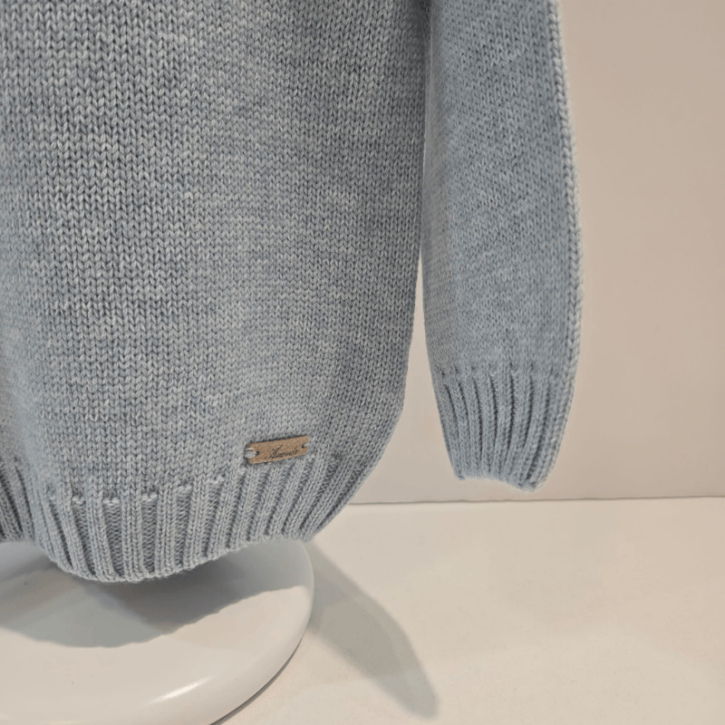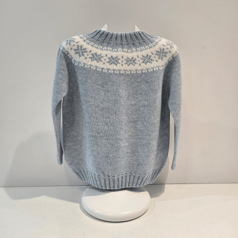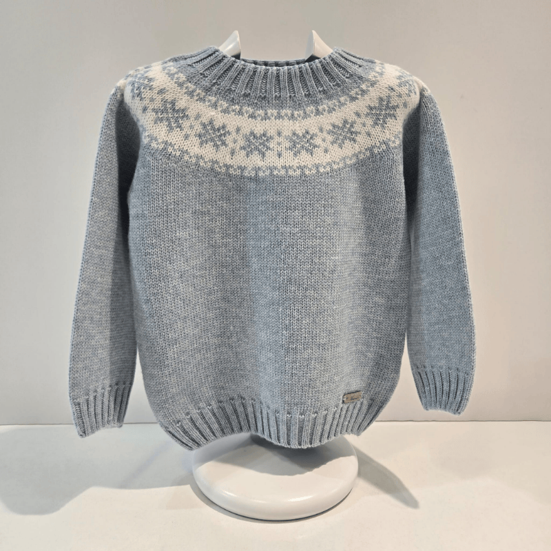 Jersey azul con grecas nórdicas de Martín Aranda. Tejido cálido, corte recto y detalles acanalados. Elegancia invernal para los más pequeños.